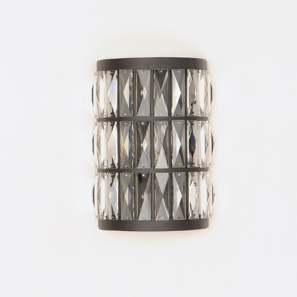 Rectilinear Beveled Crystals bejewel a Matte Black frame creates stark contrast to this radiantly prismatic display of light. The bound crystal is fixed to the frame to reduce time spent dressing the fixture.