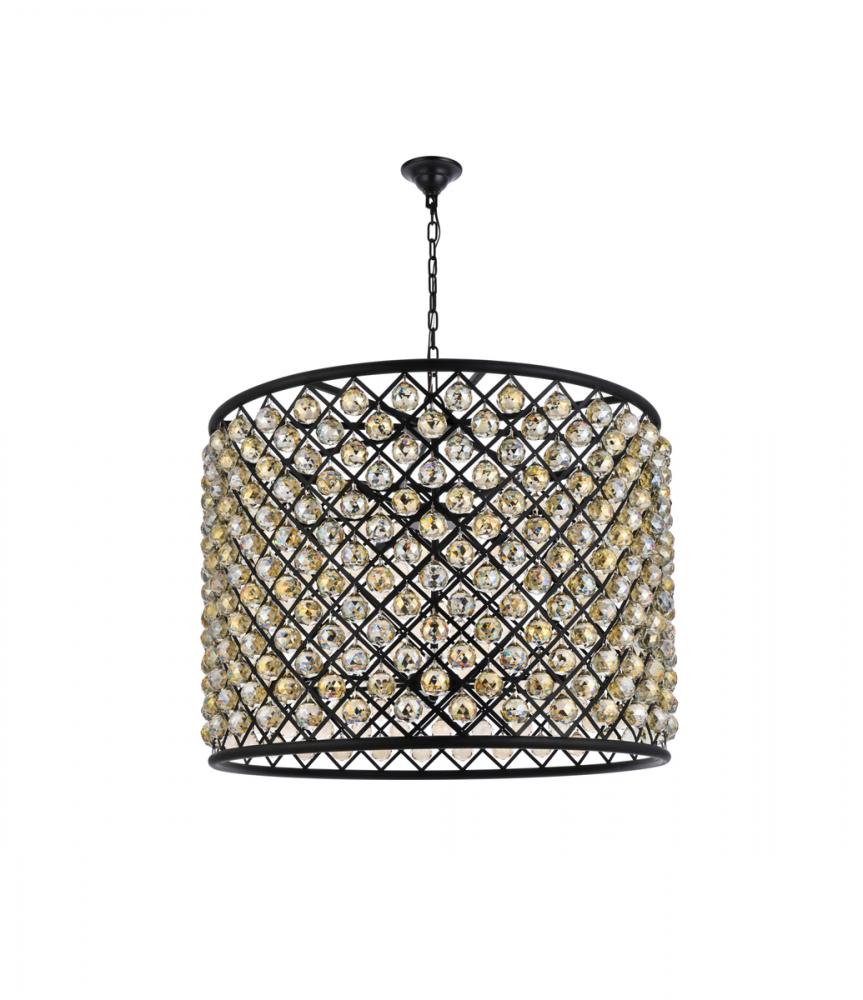 Lamp features a diameter of 35.5 inches, a height of 28 inches, a minimum hanging length of 34 inches, a maximum hanging length of 88 inches, and requires 12 candelabra bulbs
