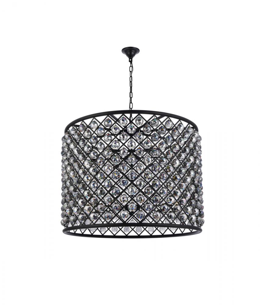 Lamp features a diameter of 35.5 inches, a height of 28 inches, a minimum hanging length of 34 inches, a maximum hanging length of 88 inches, and requires 12 candelabra bulbs