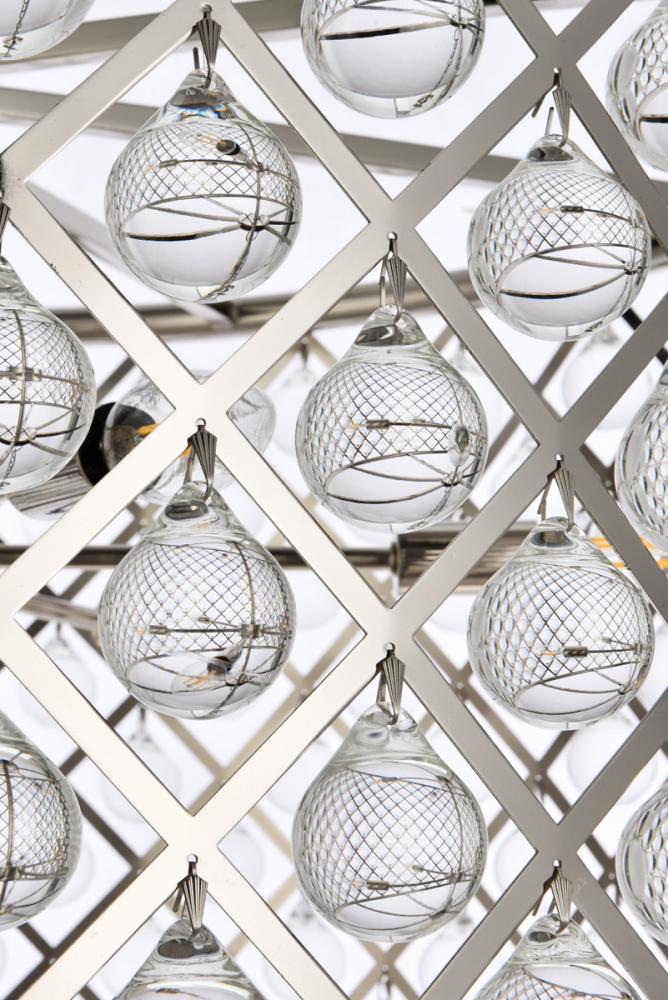 Circular steel frame and forged-iron grid suspended from a steel chain in a polished-nickel finish