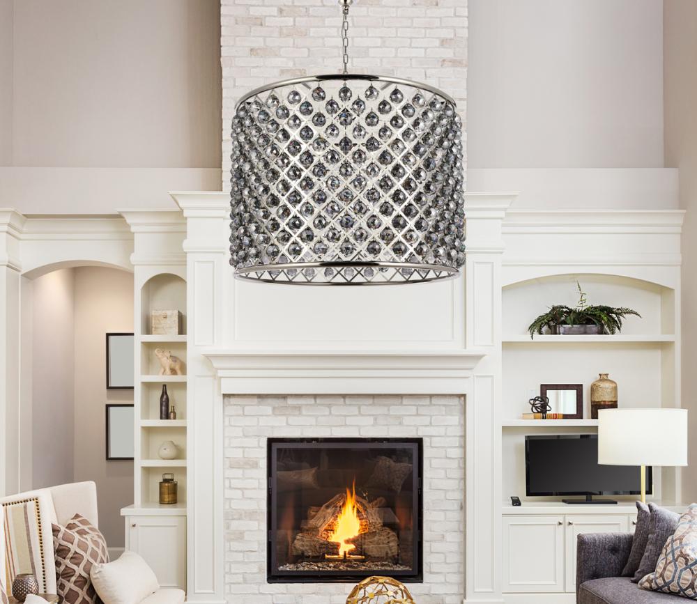 Lamp features a diameter of 35.5 inches, a height of 28 inches, a minimum hanging length of 34 inches, a maximum hanging length of 88 inches, and requires 12 candelabra bulbs