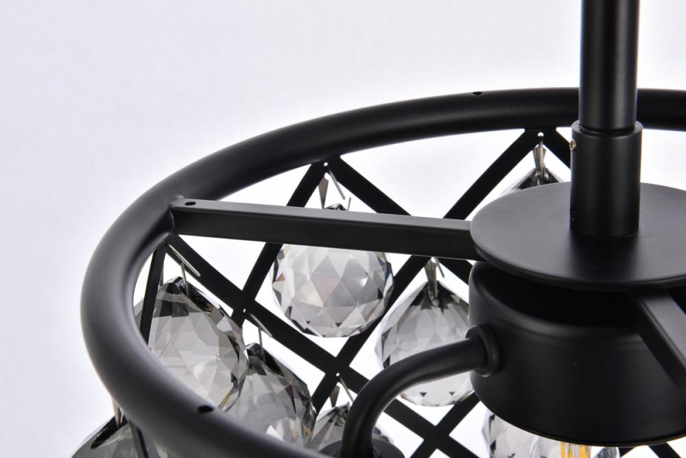 Lamp features a diameter of 12 inches, a height of 9 inches, a minimum hanging length of 15 inches, a maximum hanging length of 69 inches, and requires 3 candelabra bulbs