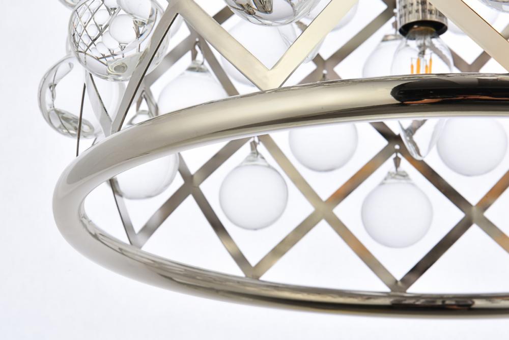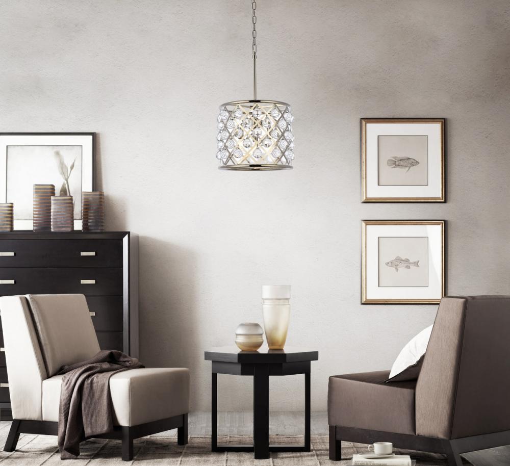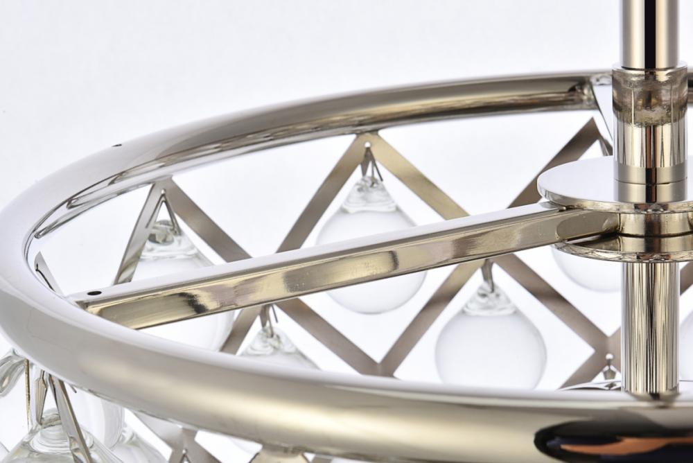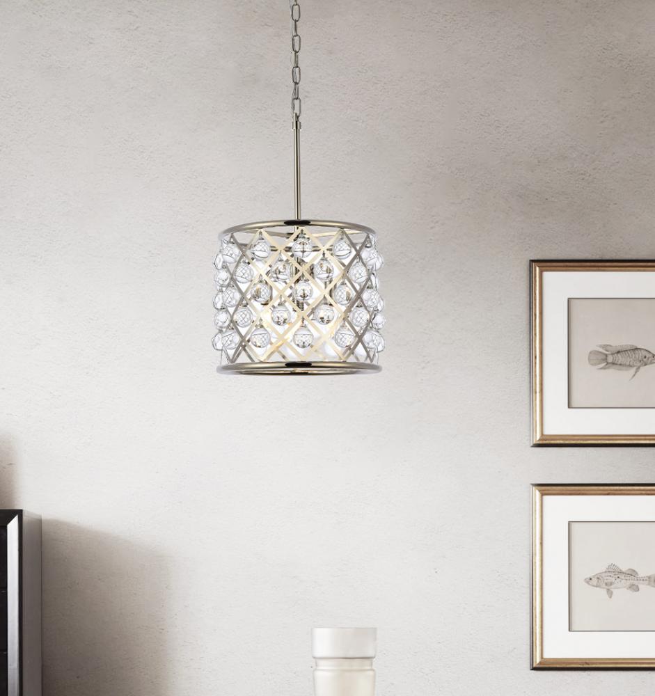 Modern simplicity meets organic beauty in the breathtakingly unique Madison collection. Hand-polished, multifaceted clear crystal spheres shimmer like dewdrops in a circular forged-iron grid with a golden-iron, mocha-brown, or polished-nickel finish. These airy pendant lamps will brighten up a kitchen, dining room, foyer, or stairwell in an explosion of reflected light.