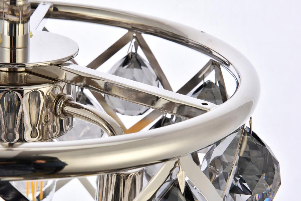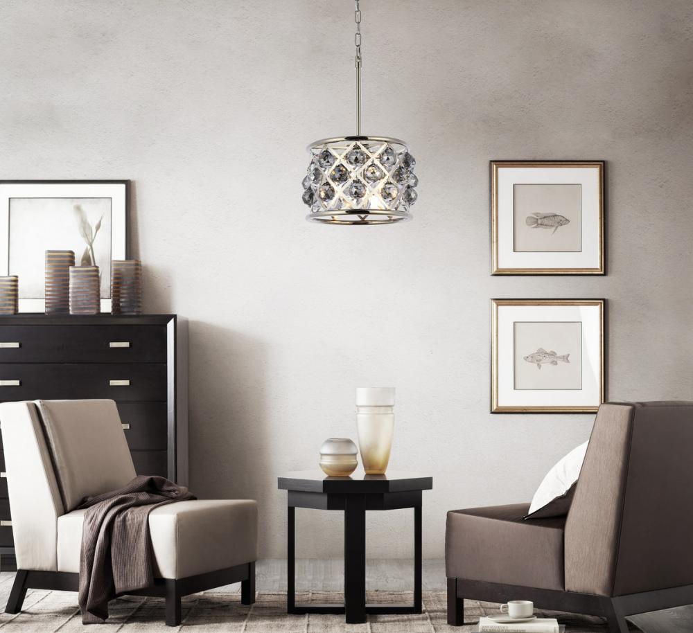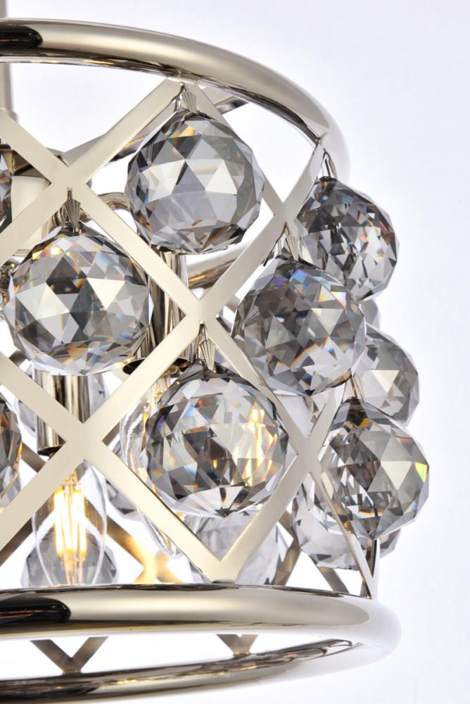 Modern simplicity meets organic beauty in the breathtakingly unique Madison collection. Hand-polished, multifaceted clear, golden-teak, or Silver-shade crystal spheres shimmer like dewdrops in a circular forged-iron grid with a golden-iron, mocha-brown, or polished-nickel finish. These airy pendant lamps will brighten up a kitchen, dining room, foyer, or stairwell in an explosion of reflected light.