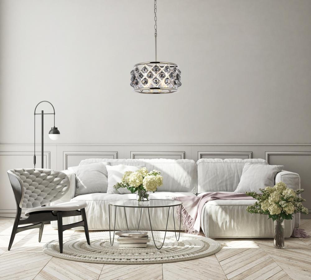 Lamp features a diameter of 16 inches, a height of 9 inches, a minimum hanging length of 15 inches, a maximum hanging length of 69 inches, and requires 4 candelabra bulbs