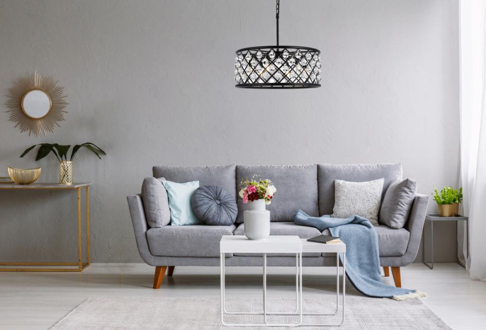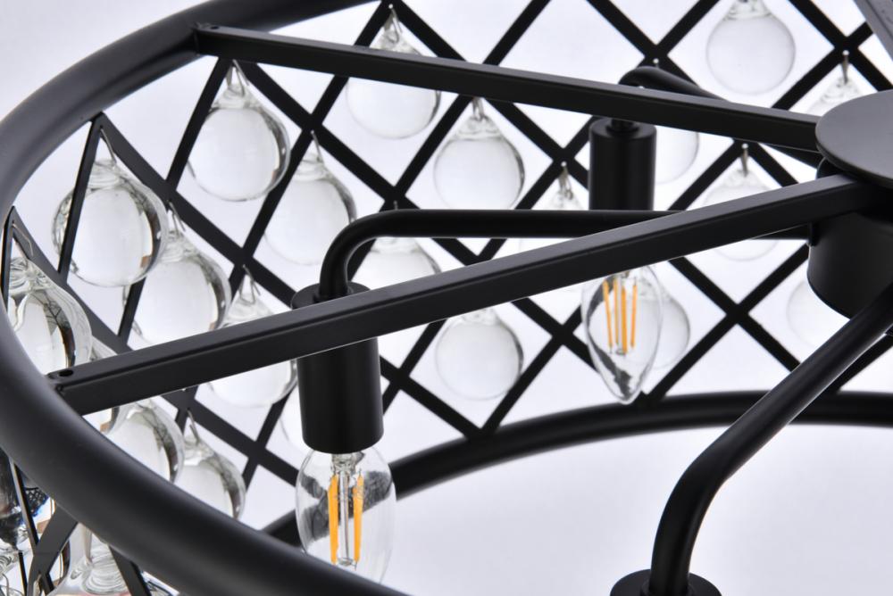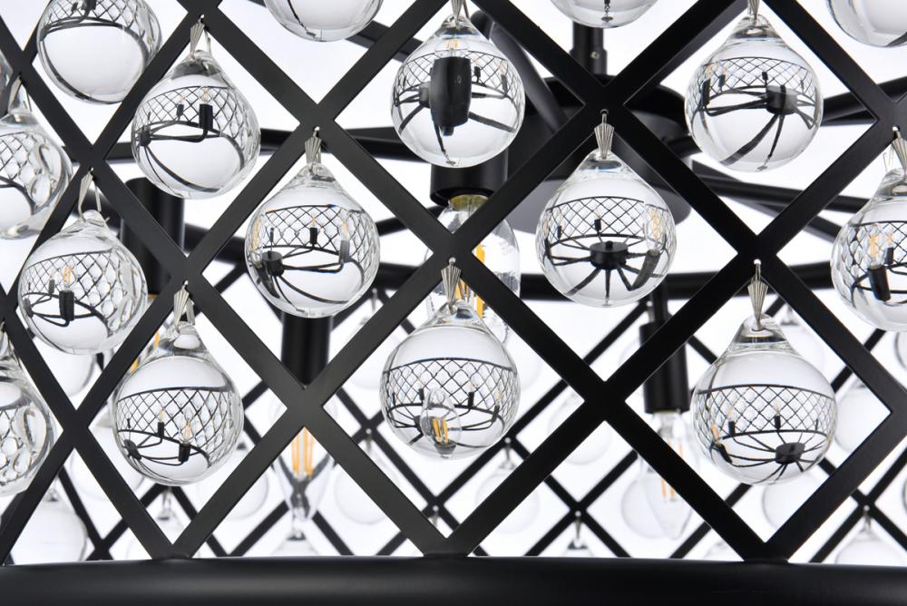 Lamp features a diameter of 25 inches, a height of 10.5 inches, a minimum hanging length of 16 inches, a maximum hanging length of 70 inches, and requires 6 candelabra bulbs