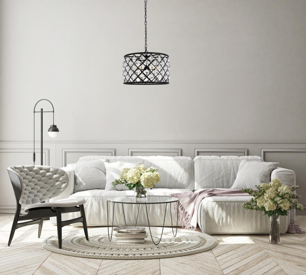 Lamp features a diameter of 20 inches, a height of 13 inches, a minimum hanging length of 18 inches, a maximum hanging length of 73 inches, and requires 6 candelabra bulbs