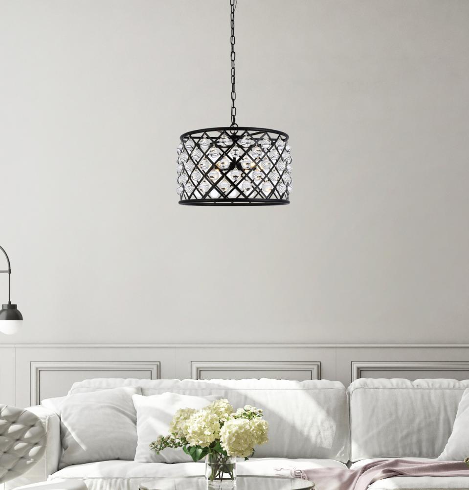 Modern simplicity meets organic beauty in the breathtakingly unique Madison collection. Hand-polished, multifaceted clear crystal spheres shimmer like dewdrops in a circular forged-iron grid with a golden-iron, Matte Black, or polished-nickel finish. These airy pendant lamps will brighten up a kitchen, dining room, foyer, or stairwell in an explosion of reflected light.