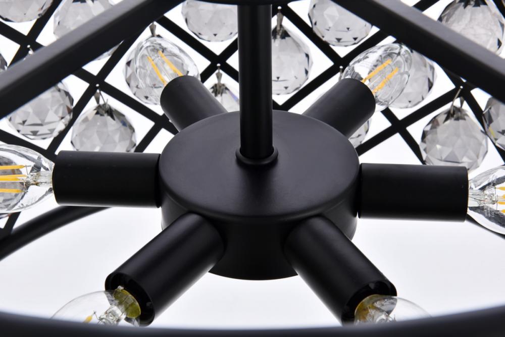 Lamp features a diameter of 20 inches, a height of 13 inches, a minimum hanging length of 19 inches, a maximum hanging length of 73 inches, and requires 6 candelabra bulbs