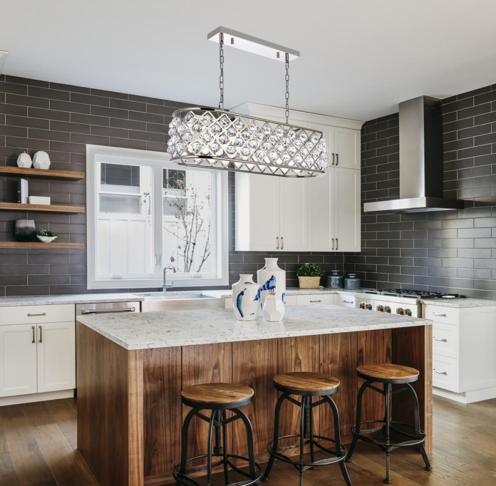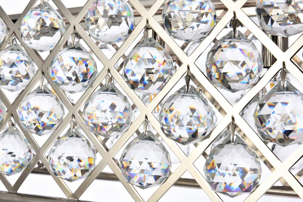 Modern simplicity meets organic beauty in the breathtakingly unique Madison collection. Hand-polished, multifaceted clear, golden-teak, or Silver-shade crystal spheres shimmer like dewdrops in an oblong forged-iron grid with a golden-iron, mocha-brown, or polished-nickel finish. These airy chandeliers will brighten up a kitchen, dining room, foyer, or stairwell in an explosion of reflected light.