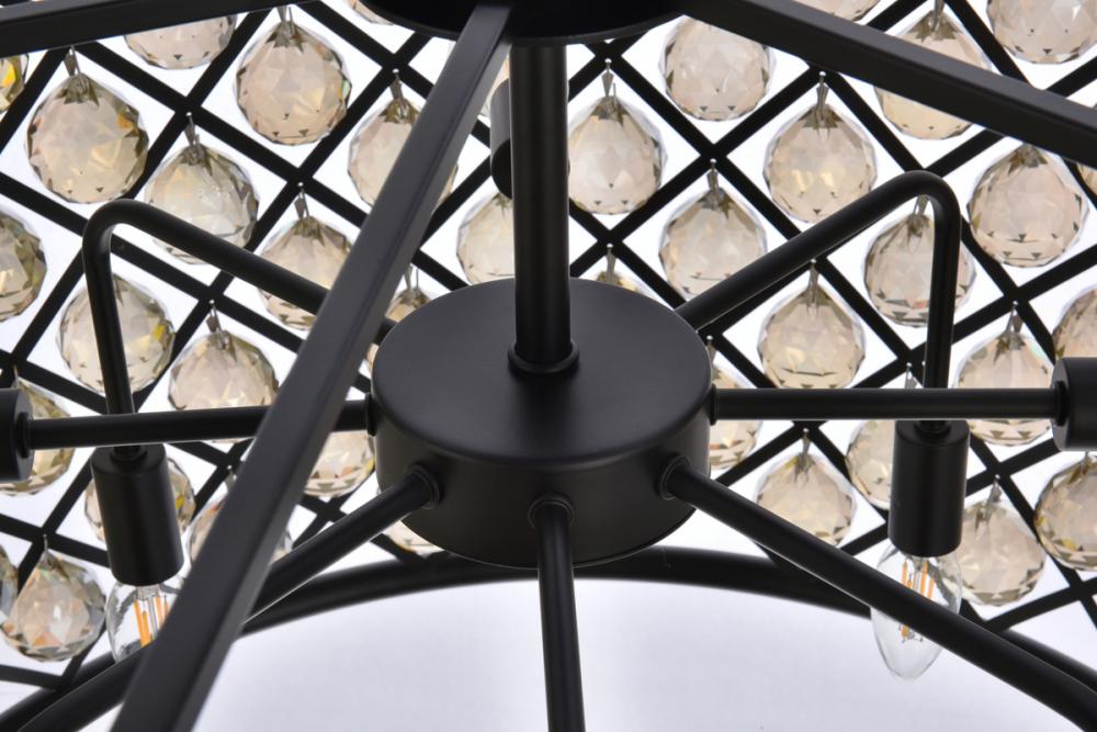 Lamp features a diameter of 27.5 inches, a height of 21 inches, a minimum hanging length of 27 inches, a maximum hanging length of 81 inches, and requires 8 candelabra bulbs