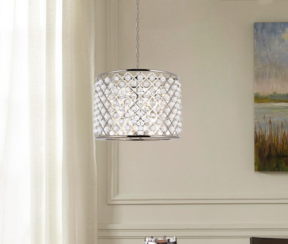 Lamp features a diameter of 27.5 inches, a height of 21 inches, a minimum hanging length of 27 inches, a maximum hanging length of 81 inches, and requires 8 candelabra bulbs