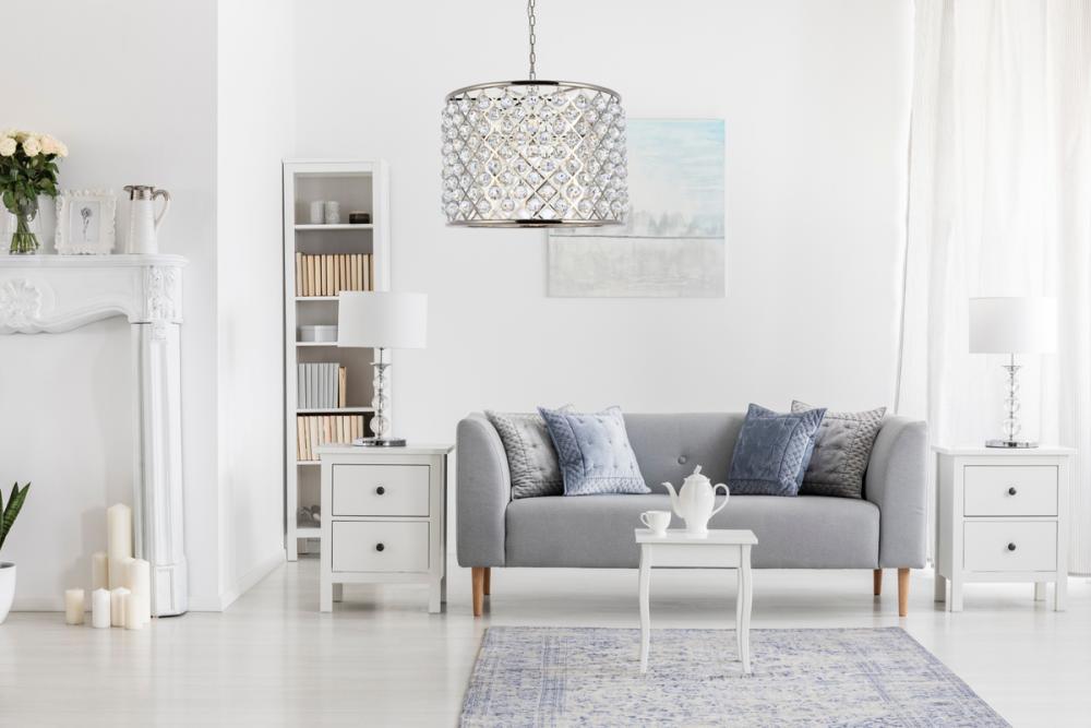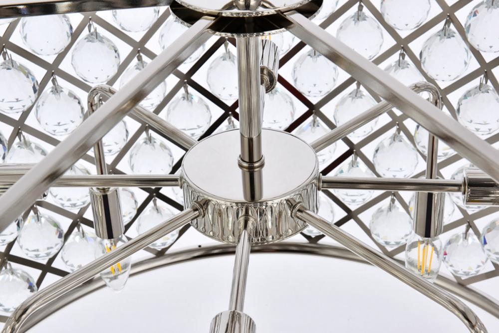 Lamp features a diameter of 27.5 inches, a height of 21 inches, a minimum hanging length of 27 inches, a maximum hanging length of 81 inches, and requires 8 candelabra bulbs