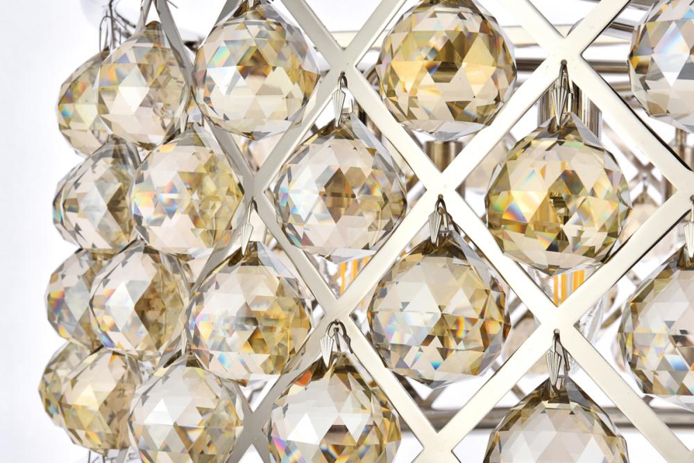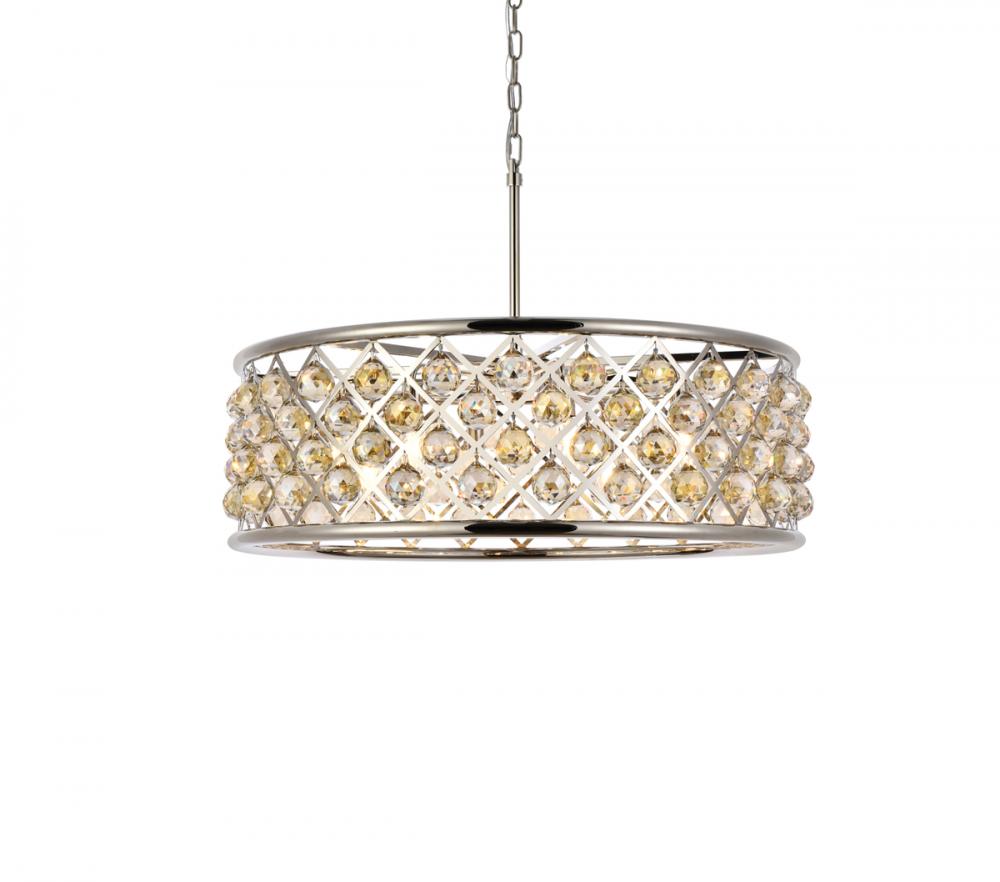 Modern simplicity meets organic beauty in the breathtakingly unique Madison collection. Hand-polished, multifaceted clear, golden-teak, or Silver-shade crystal spheres shimmer like dewdrops in a circular forged-iron grid with a golden-iron, mocha-brown, or polished-nickel finish. These airy pendant lamps will brighten up a kitchen, dining room, foyer, or stairwell in an explosion of reflected light.