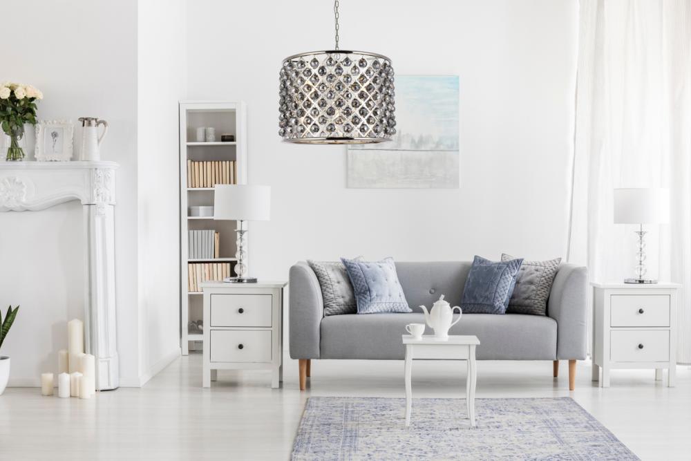 Lamp features a diameter of 27.5 inches, a height of 21 inches, a minimum hanging length of 27 inches, a maximum hanging length of 81 inches, and requires 8 candelabra bulbs