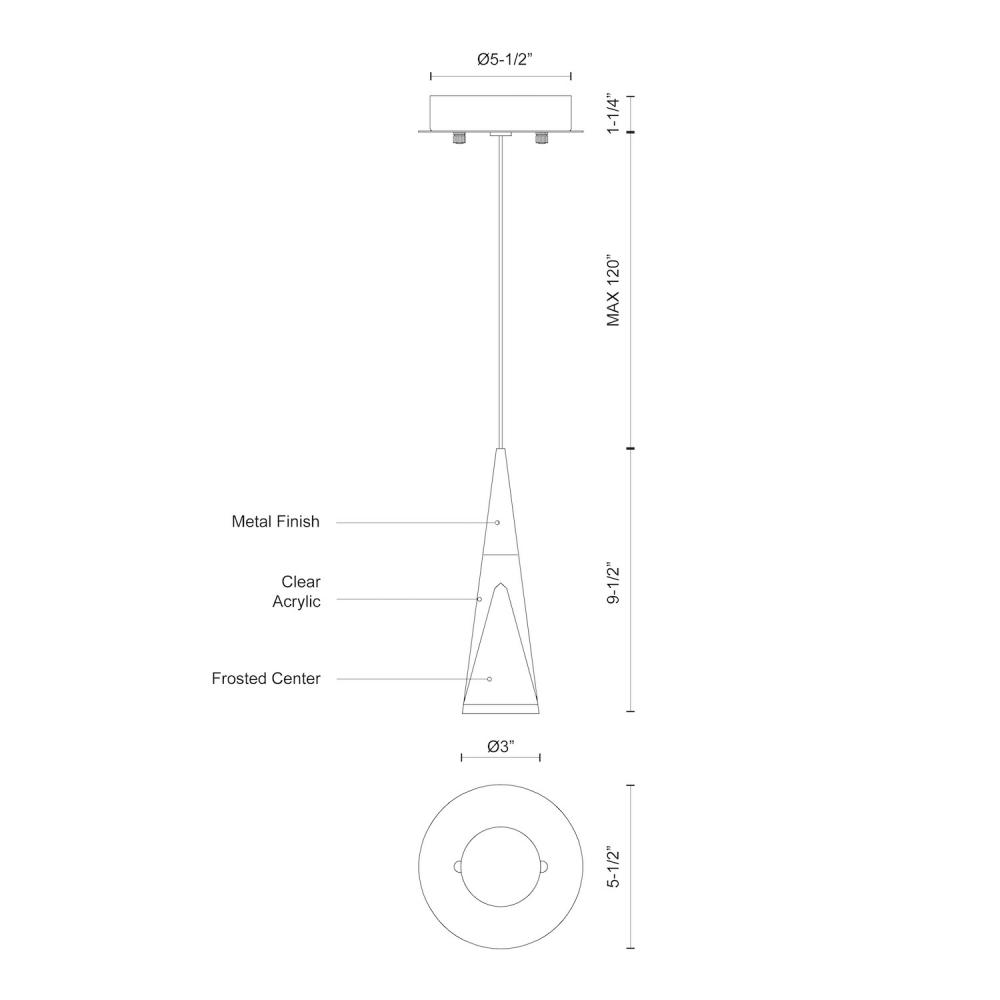 Single LED lamp pendant, unique conical shape with chrome tip, clear with internal frosted designed acrylic and chrome trimmed diffuser with frosted center. Chrome canopy and metal details, adjustable wire up to 72 inches.