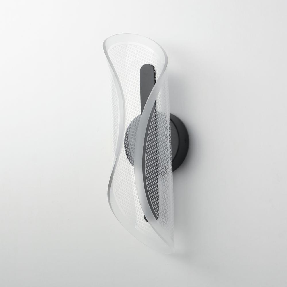 An undulating shape softly curls along its center to create an organic form constructed of a single panel of transparent acrylic. Further enhancing the form is the captivating effect of the frosted band around the borders and the patterned etching on the a