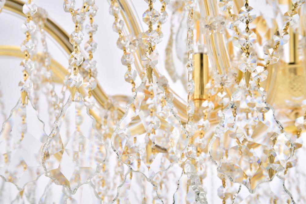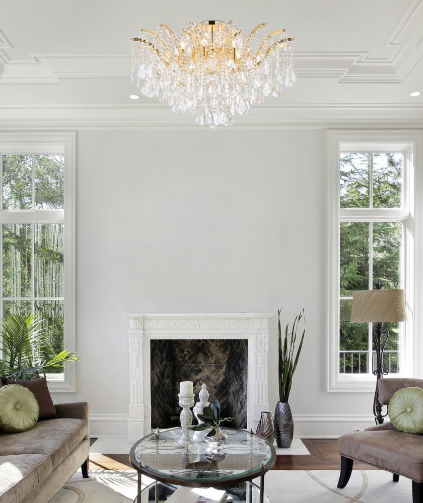 A heavenly high point to your home, Maria Theresa collection flush mount fixtures are ablaze with resplendent crystals. Copious strands of sparkling clear crystals dangle from elaborate tiers of glass-coated steel arms. An imperial favorite for the stairwell, dining room, or living room.