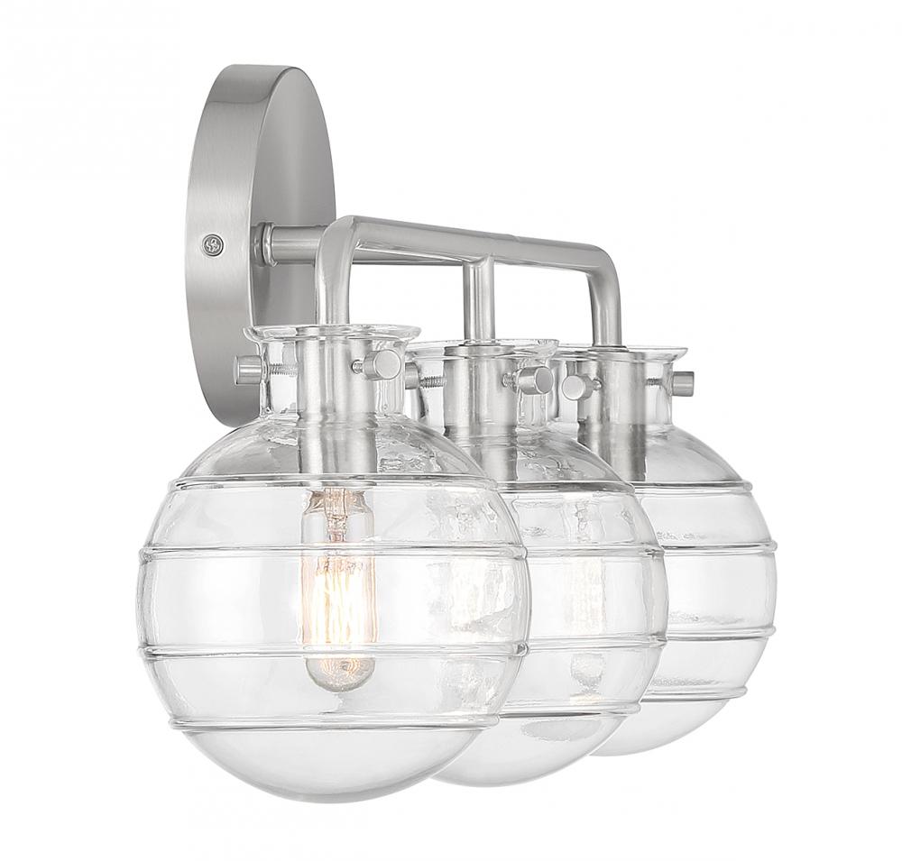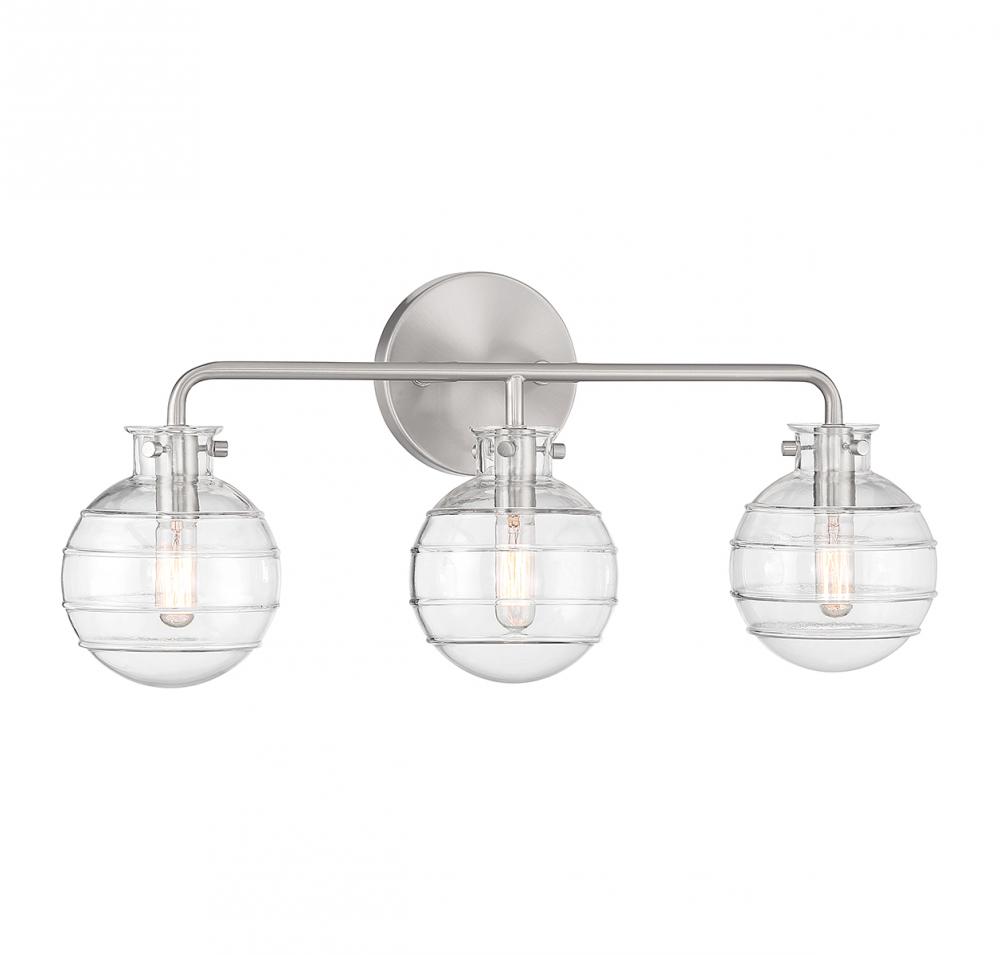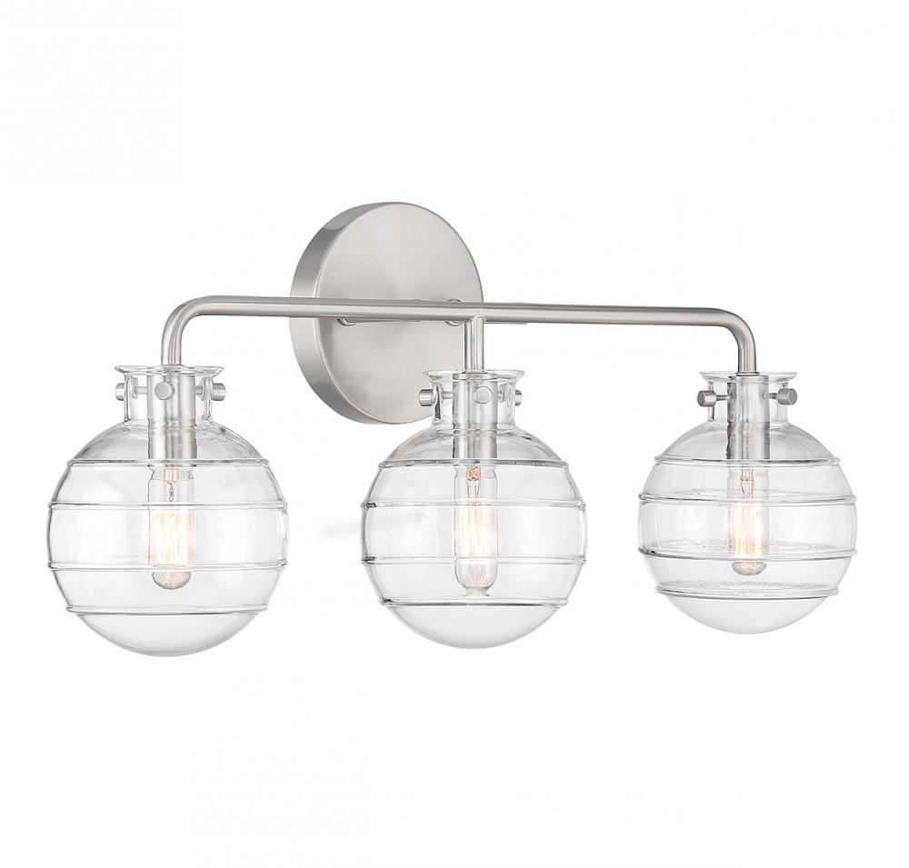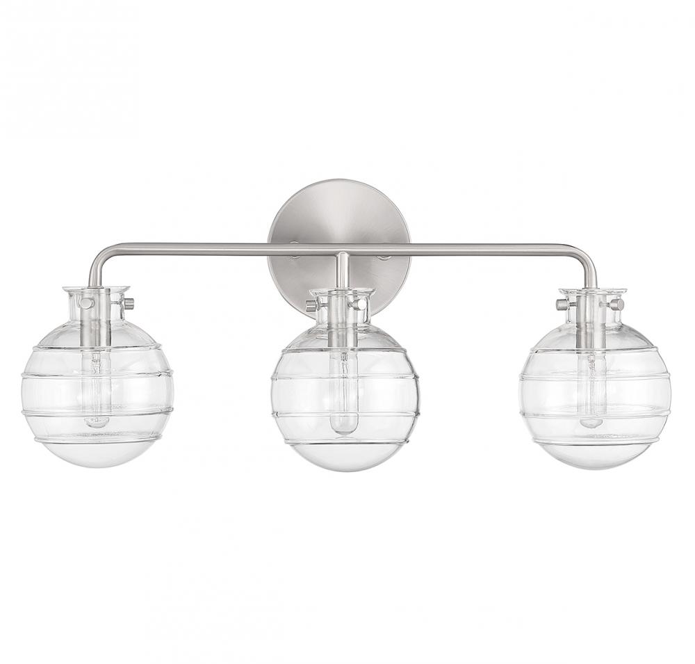 Create a textural, intriguing look with the Savoy House Mason 3-light bath vanity light. Clear swirl glass orbs take center stage in a streamlined design that has a satin nickel finish. Mason is 10" in height, 22" in width and extends 6.25" from the wall. It uses three candelabra size bulbs of up to 60 watts per bulb (bulbs not included).