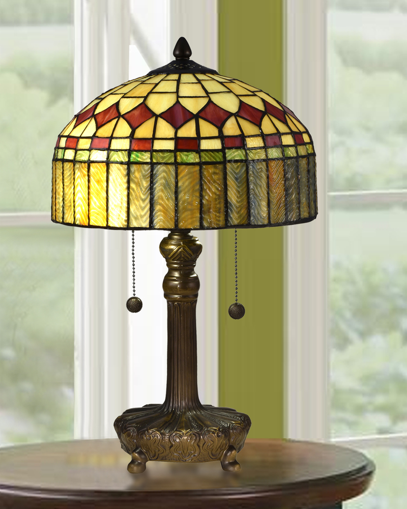 Our Mayor Island Lamp features eye-catching colors and shapes that will become an instant focal point in any room of your home. The large extended dome shade features a base color of sunny amber that is hand set in an alternating wedge pattern around the top of the shade. Just below, a row of diamond glass pieces in contrasting dark amber seems to jump off the surface. Dual borders, one of alternating light and dark amber the other of green-gold give way to elongated rectangles of an iridescent blend of both shades of amber for a lovely change of texture. The shade sits atop a substantial metal base that is finished in Antique Bronze and features reeding on the center column and a beautifully cast footed pedestal. The cast metal vase cap and finial are finished to match the base. A stunning statement when displayed in pairs on matching end tables or nightstands, our Mayor Island Table Lamp is destined to become an heirloom piece you will proudly display for many years to come.