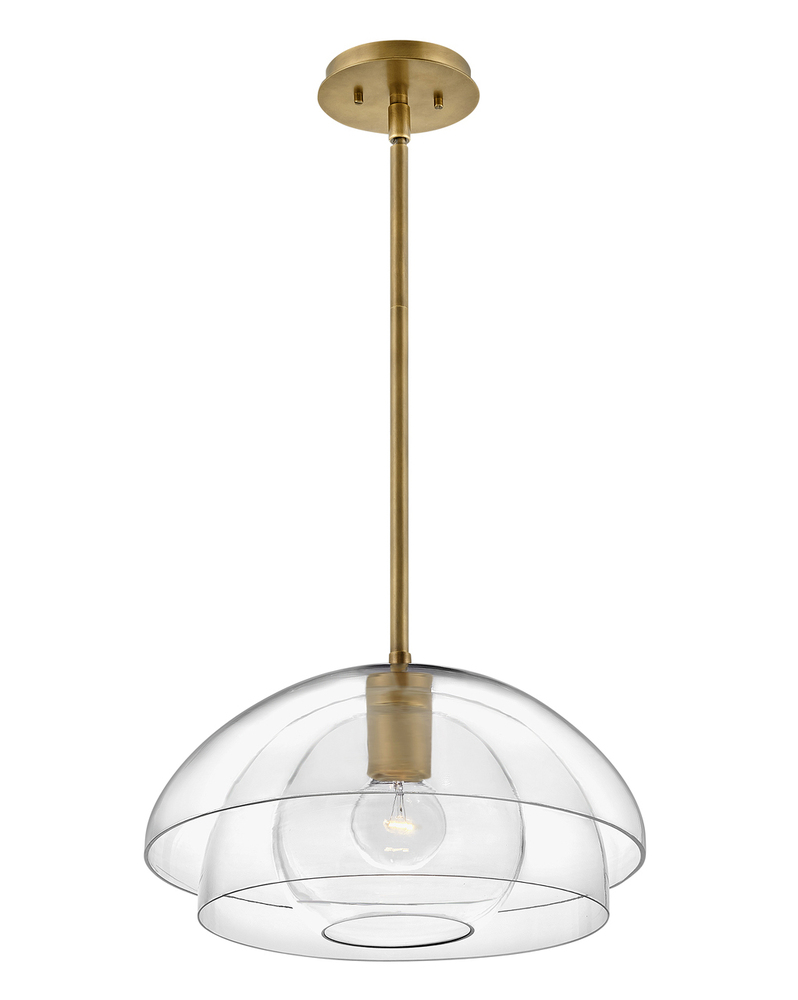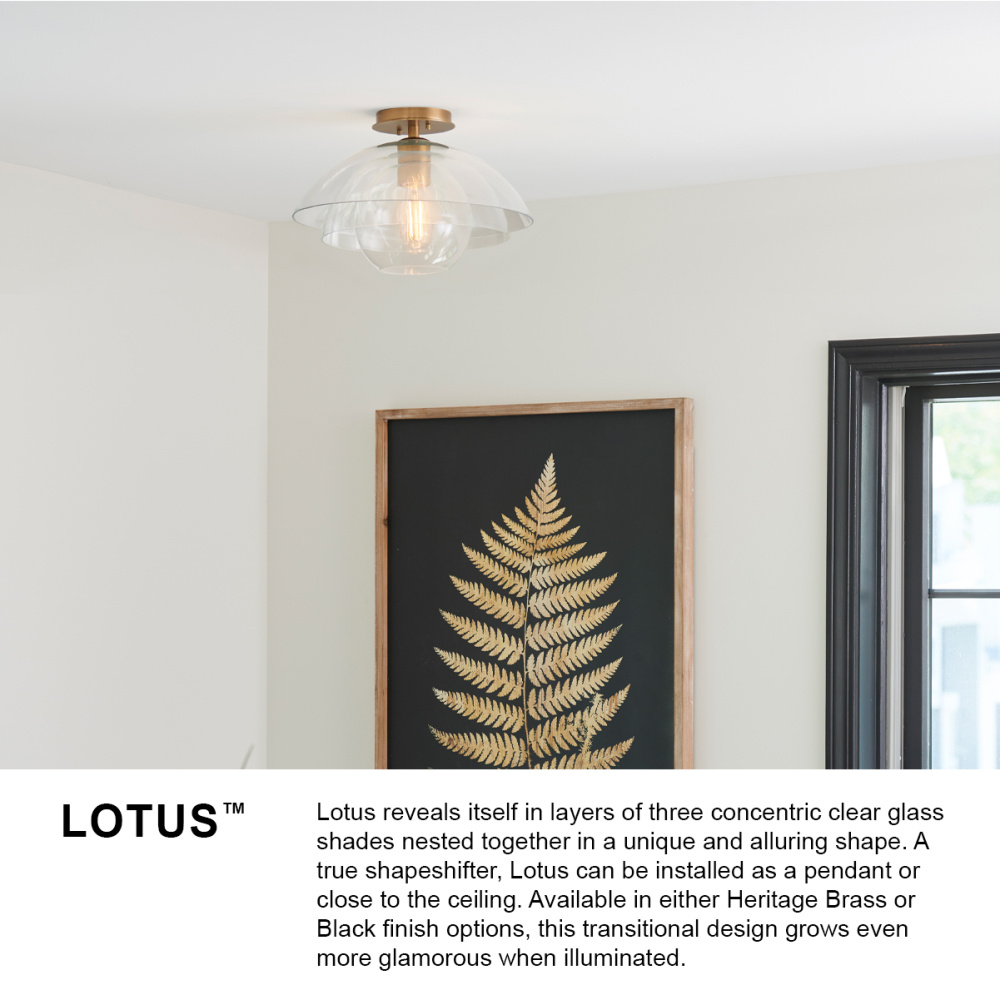 Lotus reveals itself in layers of three concentric clear glass shades nested together in a unique and alluring shape. A true shapeshifter, Lotus can be installed as a pendant or close to the ceiling. Available in either Heritage Brass or Black finish options, this transitional design grows even more glamorous when illuminated.