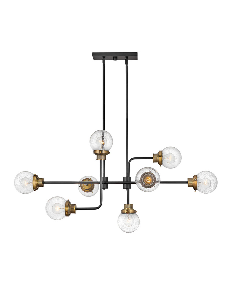Poppy features clear seedy glass spheres that bubble out of refined, ribbed fitters to create a simple, yet sophisticated silhouette. The dual-finish combinations, Black with Brushed Nickel and Black with Heritage Brass, pair perfectly with a clean backplate or canopy and crisp crossbars to anchor this airy design. Poppy showcases mid-century style with a spectacular spin.