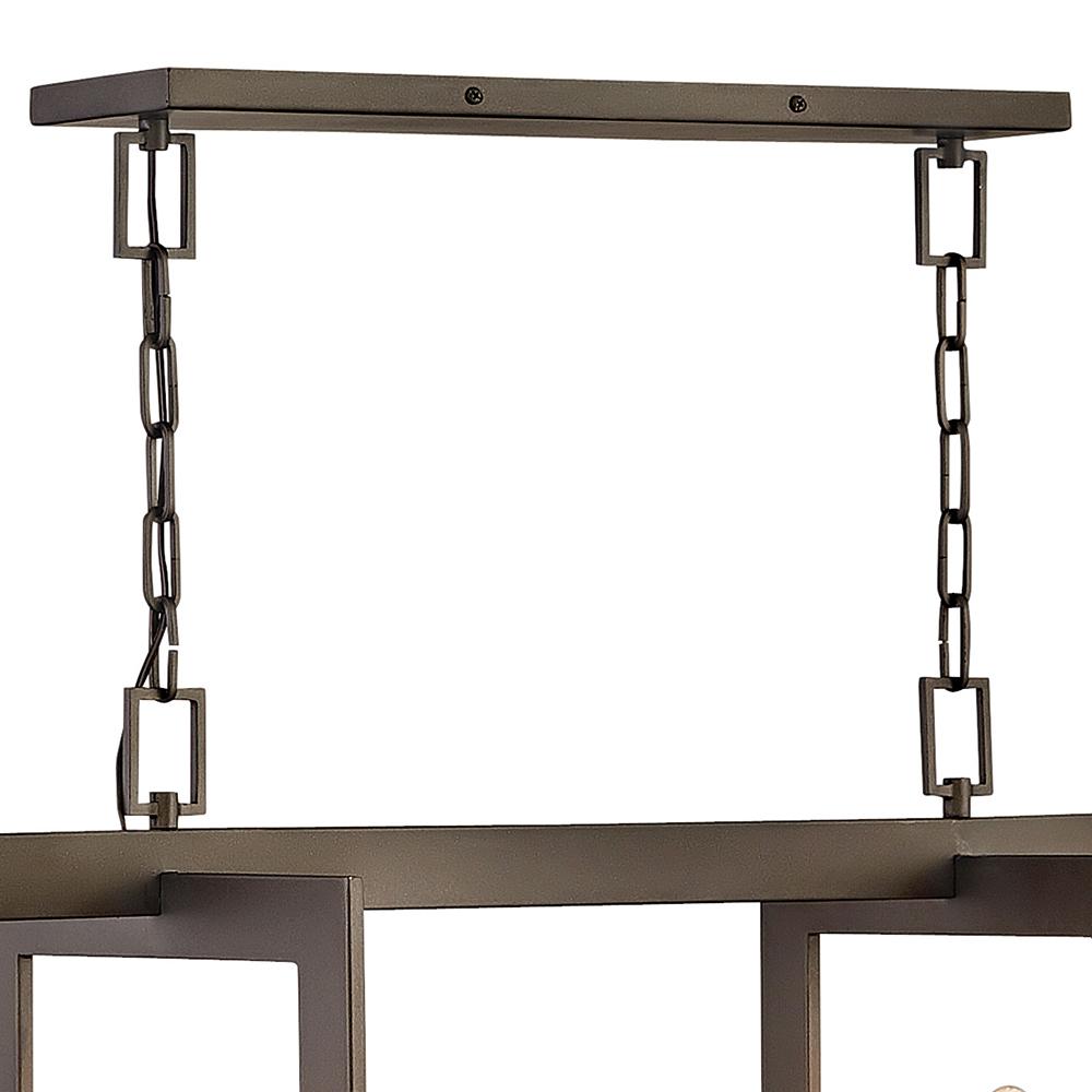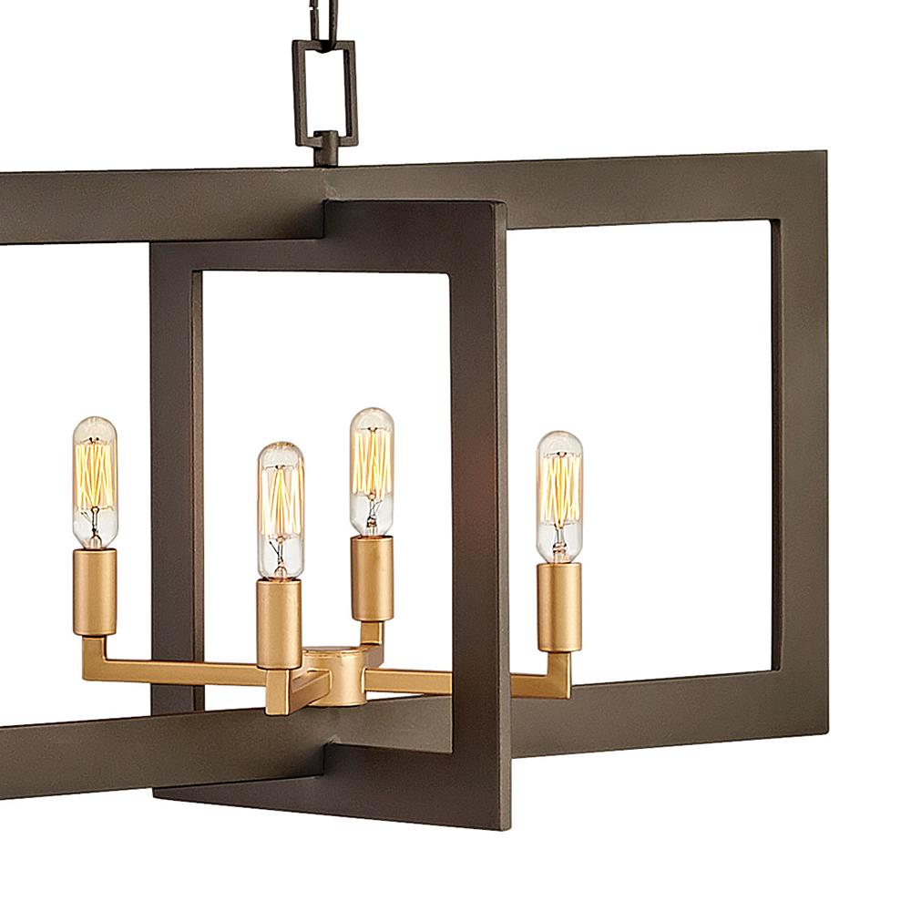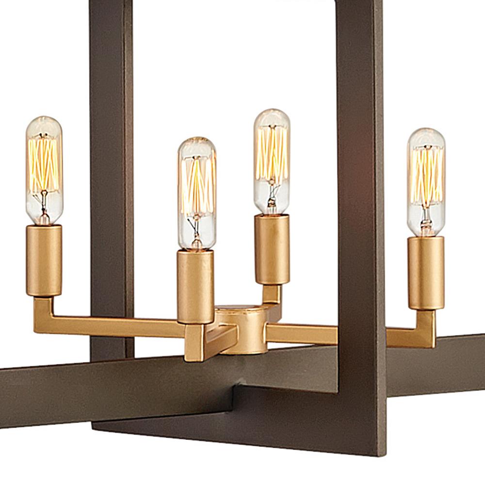 Anders is a staunch supporter of mixed metals and shapes. Metallic Matte Bronze finish rectangles intersect to create the boxy, open outer frame as the circular, spoked Deluxe Gold accent finish candelabra branches out from inside. These contrasting but complementary elements make a powerful contribution to a transitional décor.