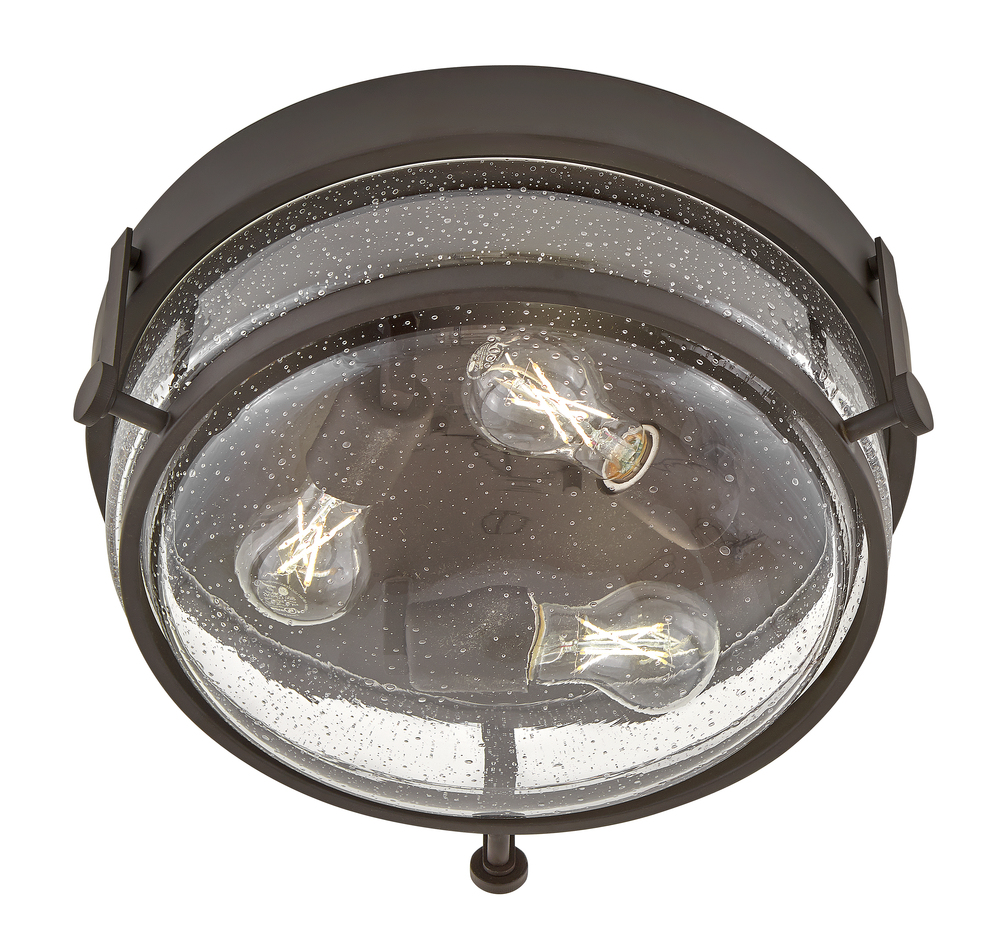Harper’s sleek, retro design elevates the traditional ceiling mount with a unique clear seedy glass bound by a prominent metal ring and decorative knobs. Available in five classic finishes.