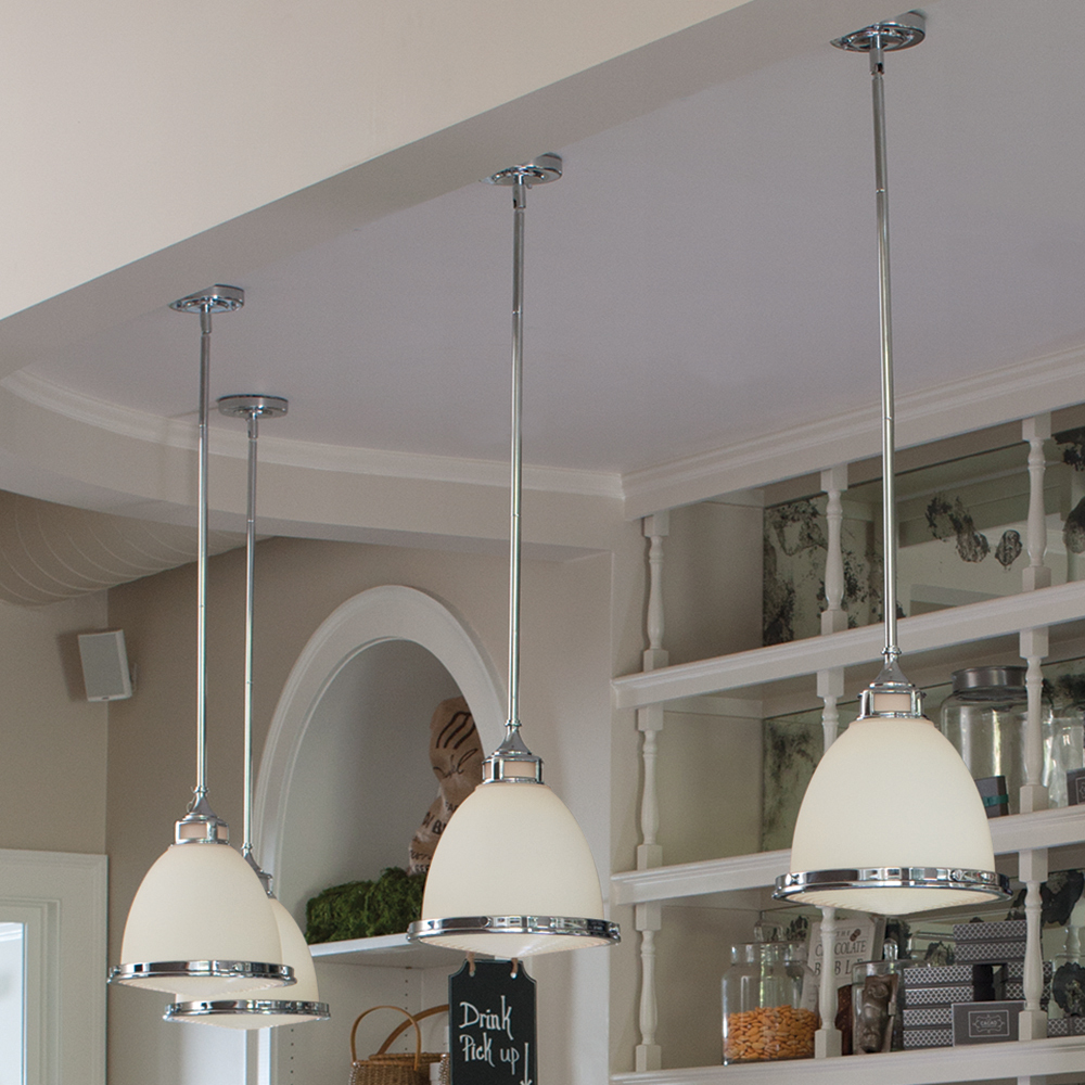 Amelia's classic pendant design reinvents vintage details with a cast metal fitter, decorative metal trim ring and ornamental knobs. Bold finish options glow with retro inspiration.