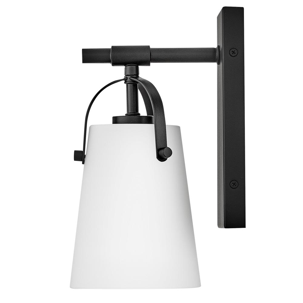 Clean and airy, Foster breathes composed simplicity into any bath space. Its softly tapered glass shade, suspended from arched handle prongs, creates a sophisticated transitional silhouette, enhanced by practical yet stylized details.