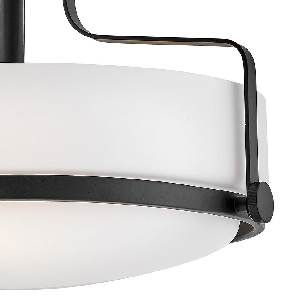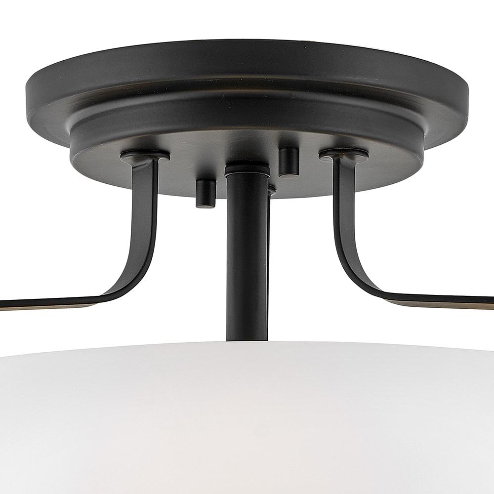 Harper’s sleek, retro design elevates the traditional ceiling mount with a unique clear seedy glass bound by a prominent metal ring and decorative knobs. Available in five classic finishes.