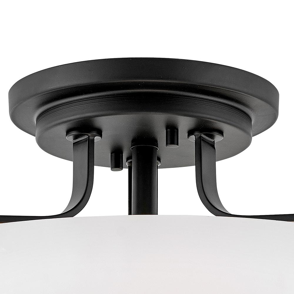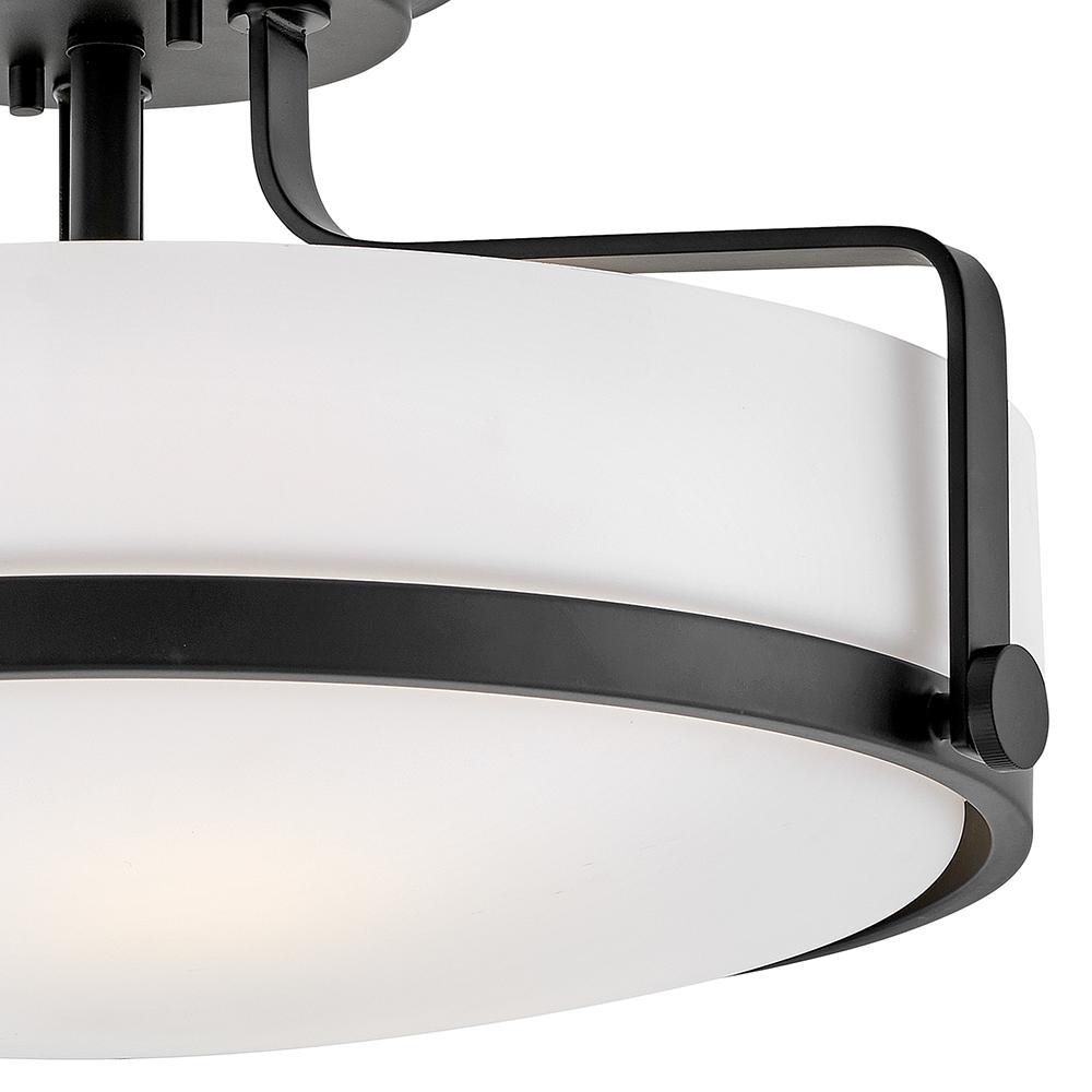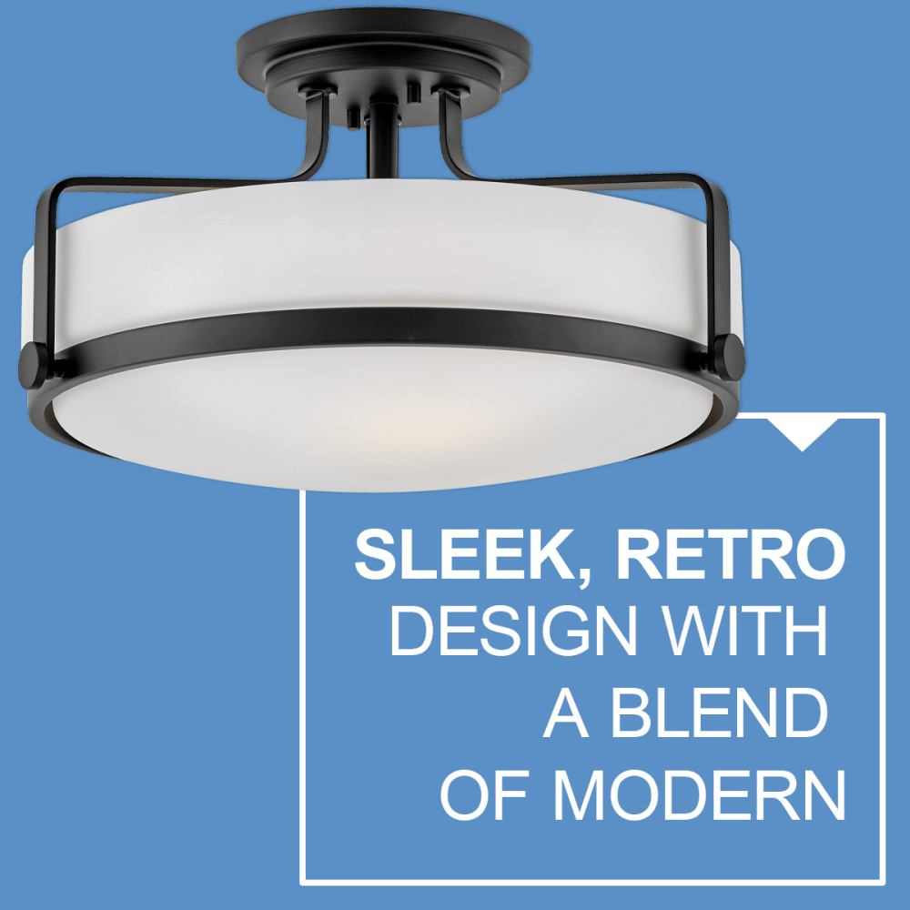 Harper’s sleek, retro design elevates the traditional ceiling mount with a unique clear seedy glass bound by a prominent metal ring and decorative knobs. Available in five classic finishes.