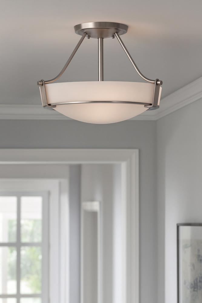 Hathaway’s striking design features a bold shade held in place by three intersecting, floating arms with unique forged uprights and ring detail for a modern style.