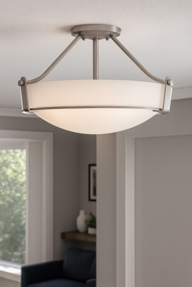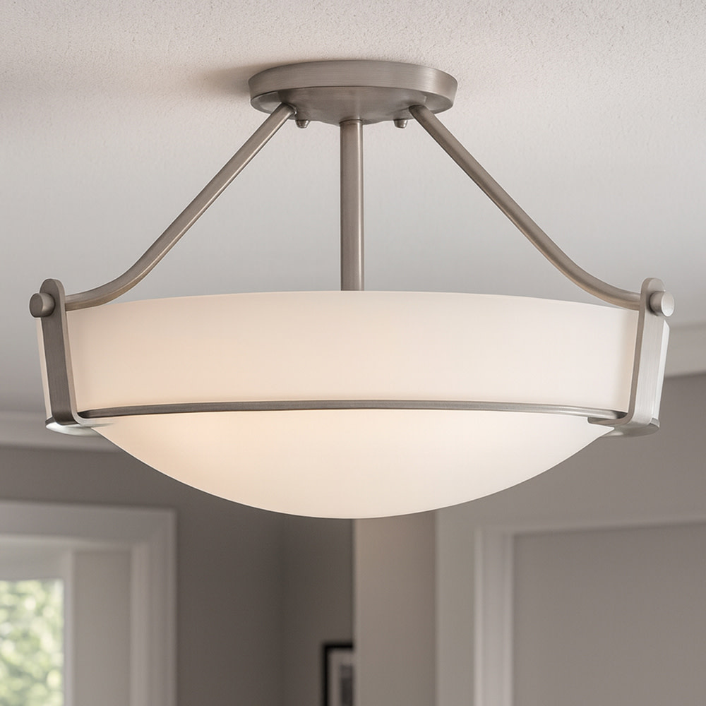 Hathaway’s striking design features a bold shade held in place by three intersecting, floating arms with unique forged uprights and ring detail for a modern style.