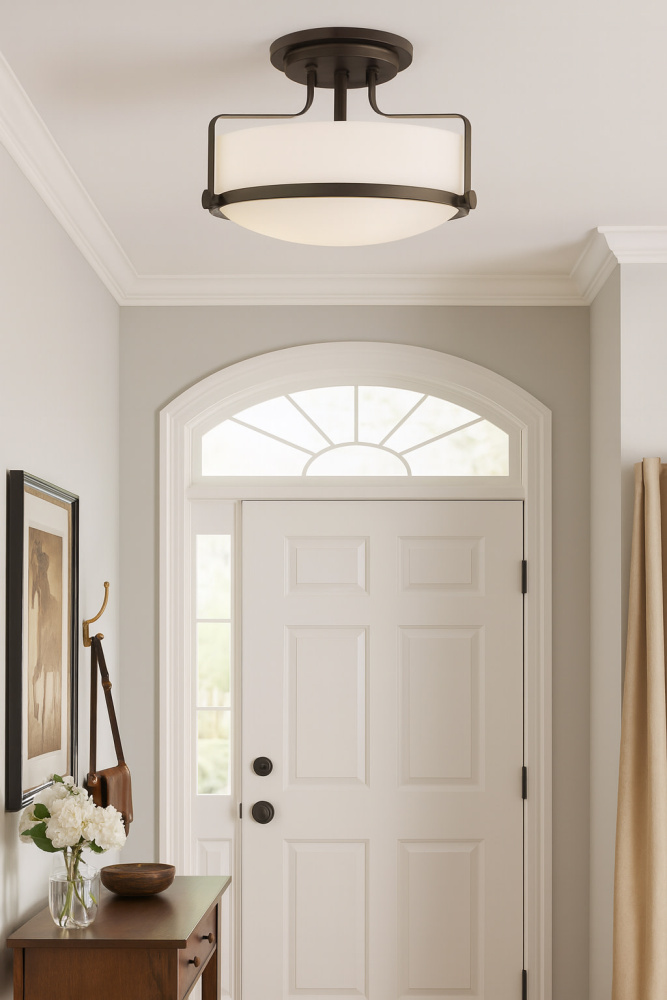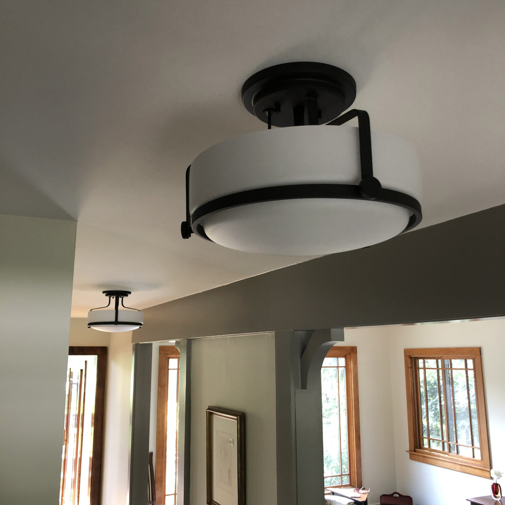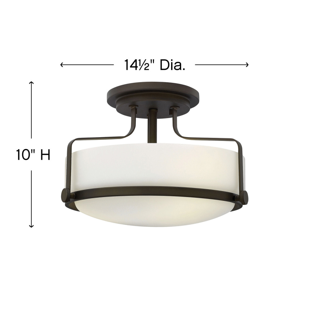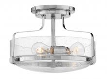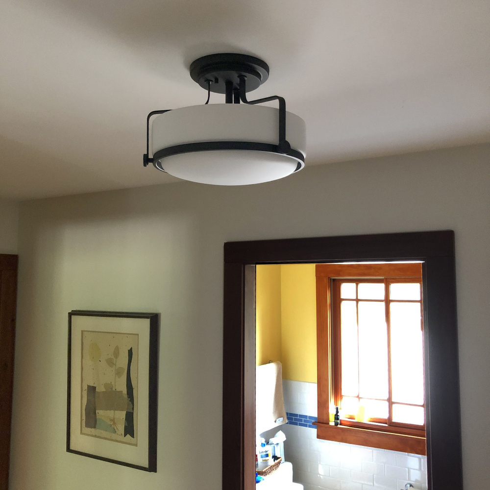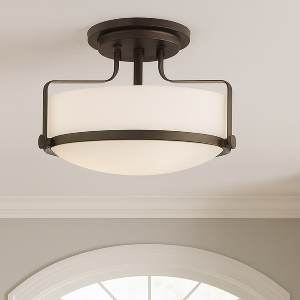 Harper’s sleek, retro design elevates the traditional ceiling mount with a unique clear seedy glass bound by a prominent metal ring and decorative knobs. Available in five classic finishes.