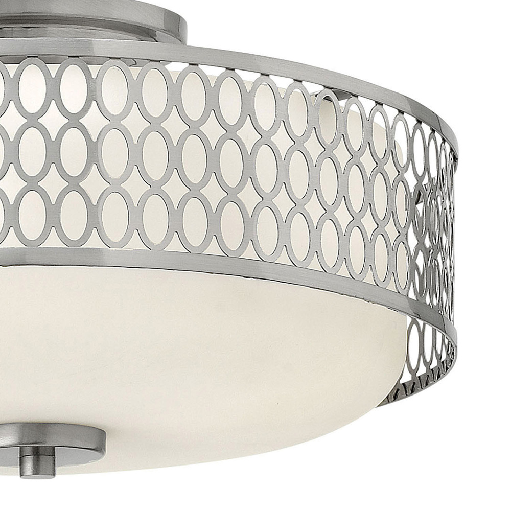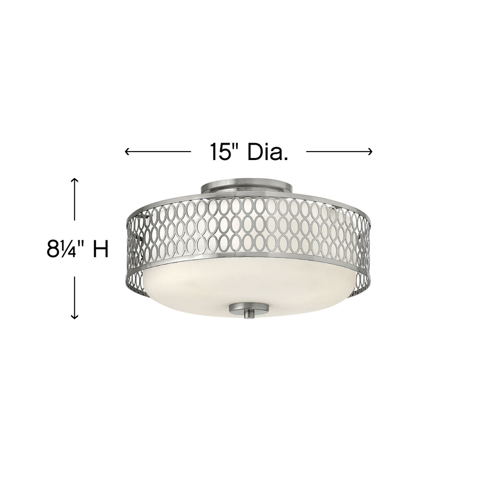 Jules features a repeating stamped oval design in a luxe Brushed Gold or Brushed Nickel finish. This striking pattern play creates a statement-making transitional silhouette.