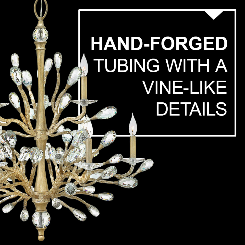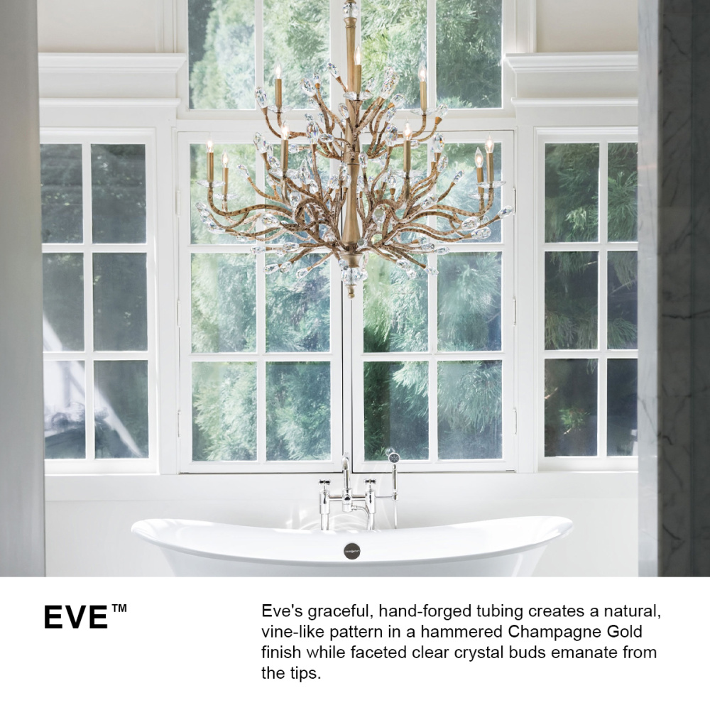 Eve’s graceful, hand-forged tubing creates a natural, vine-like pattern in a hammered Champagne Gold finish while faceted clear crystal buds emanate from the tips.