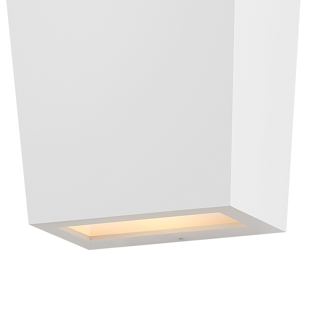 Cruz catches the eye with its modern, sleek design and trapezoidal silhouette. Available in Black and Textured White finish options, Cruz emits a beautiful wall wash illumination through the etched glass to enhance modern façades. Mounting versatility allows individuals to display either the small or large side up or down. LED bulb is included.