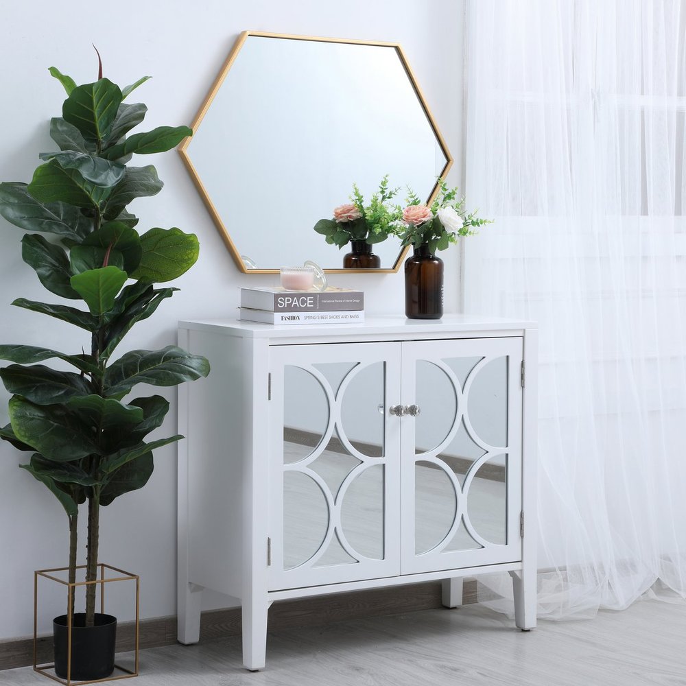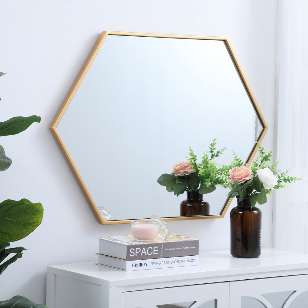 Add a bit of visual fun to your home with this playful hexagonal-shaped mirror. Its stylish personality will mingle with your décor and create a mesmerizing display of contemporary excitement. The clear mirror opens the visual space of your room, while the slender metal frame adds subtle color. Available in a black, brass or Silver finish and comes in a variety of sizes--it's the perfect mirror for any sized home.