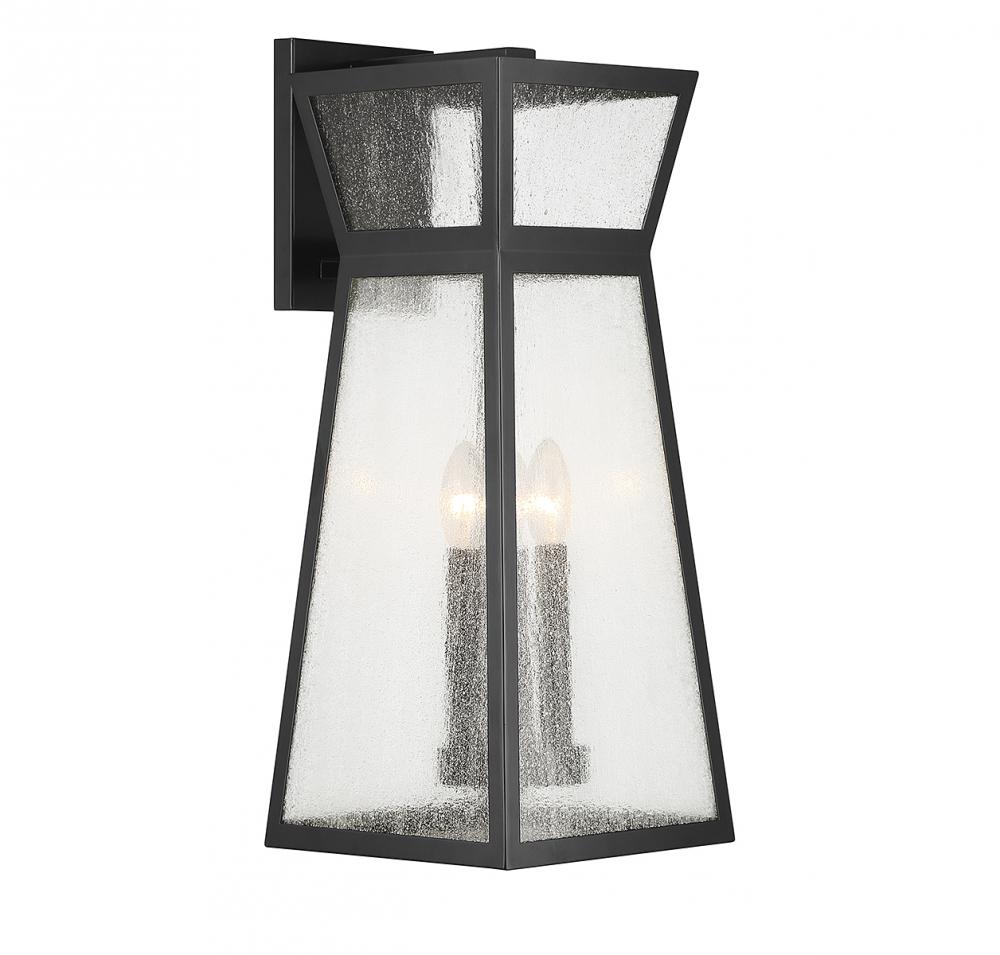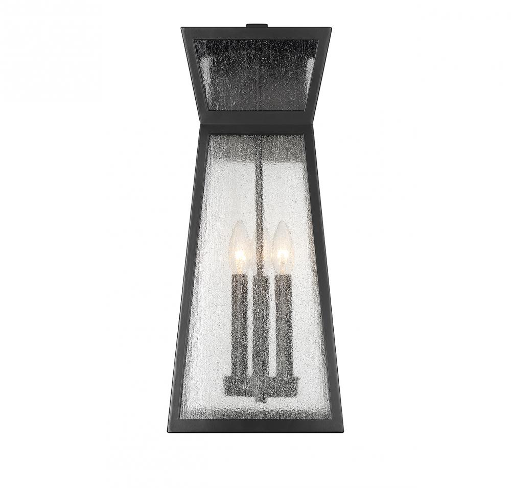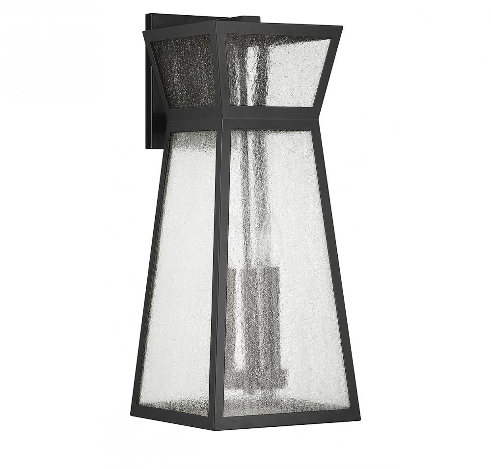 From Savoy House, the Millford 3-light outdoor wall light showcases a more contemporary take on classic lantern-style illumination with a sharply angular shape and panes of seedy glass. Matte black finish. Millford is 22" in height, 9" in width and extends 10.5" from the wall. It uses 3 candelabra size bulbs of up to 40 watts per bulb (bulbs not included).