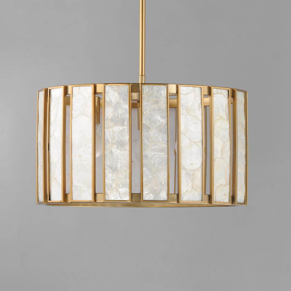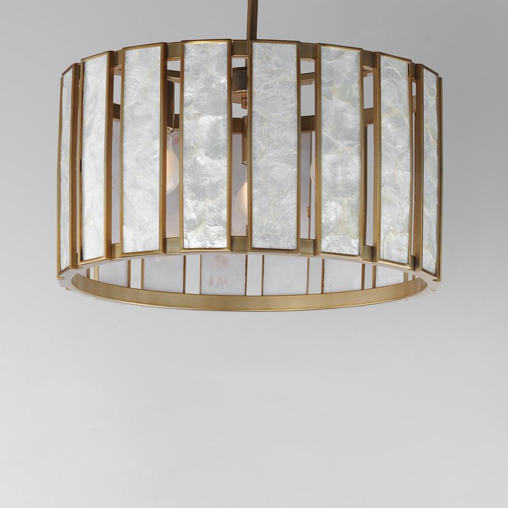 Classic in form and evoking the sea, laminae of Capiz shell are framed in paneled drum shapes. The Natural Aged Brass finish refines the coastal elements and complements the warm glow from behind the translucent panels. Available in multiple configurations