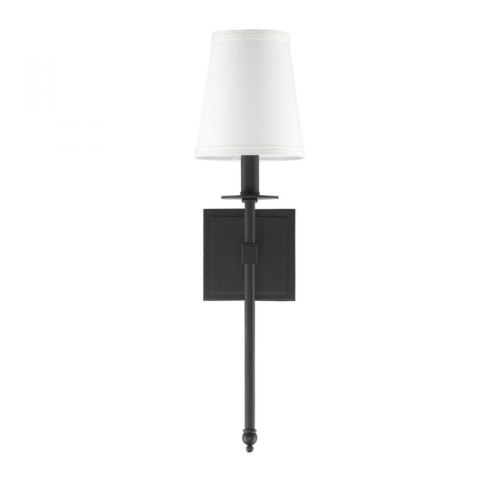 This Savoy House Monroe 1-light sconce features a long sleek body, a white fabric shade and a classy, visual contemporary silhouette. Matte black finish. Sconces add a touch of style and light to any wall, including but certainly not limited to hallways, entryways, stairways, great rooms and dining rooms. You will also often see a pair of sconces flanking a bathroom vanity mirror to provide an even, flattering wash of light. Bulb not included. The matte black finish can be paired with black hardware or mixed with hardware in other finishes. Monroe is a perfect, comfortable addition to rooms of any style, especially transitional or classic. When you choose a Savoy House lighting fixture, you can be certain you’ve selected a piece that will withstand the test of time.