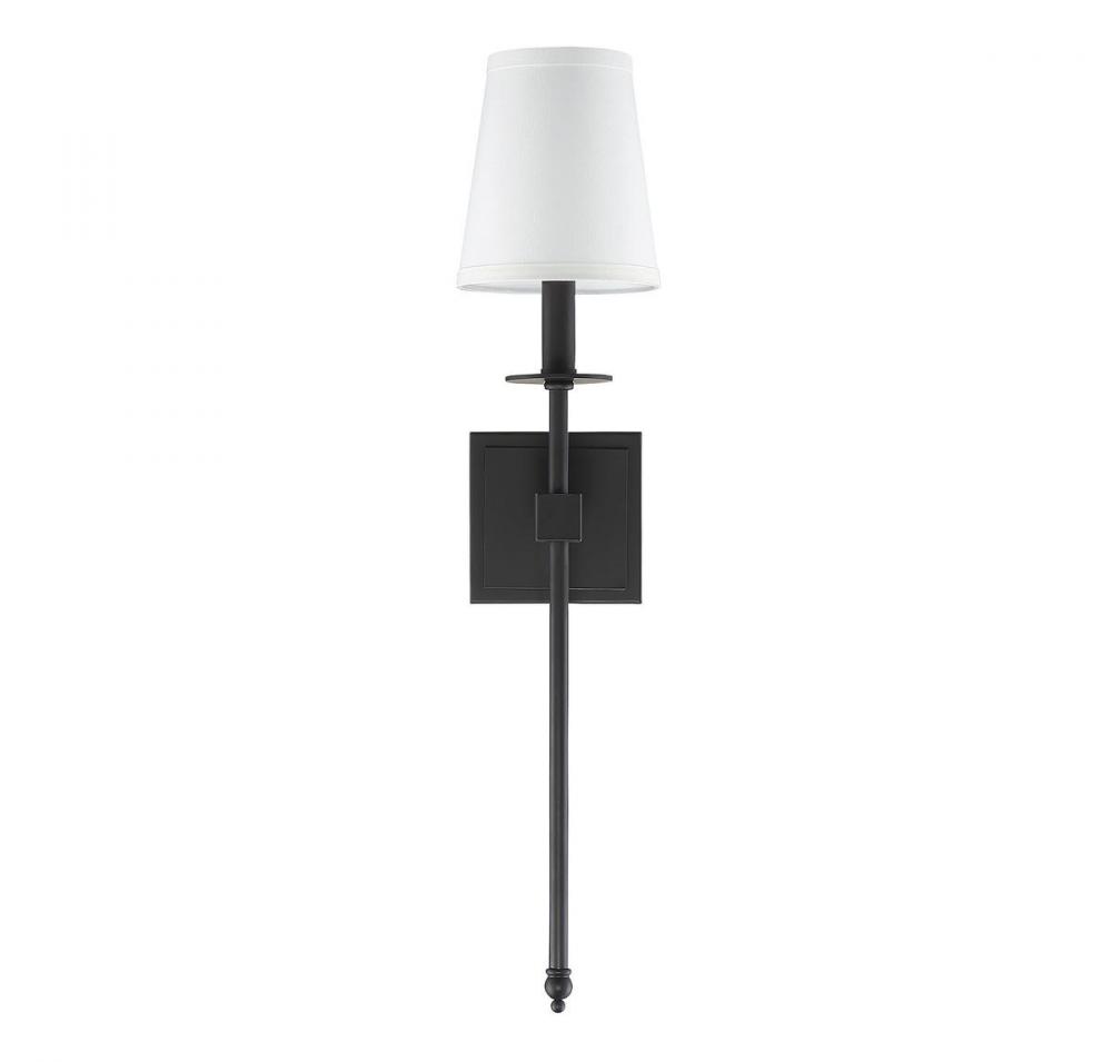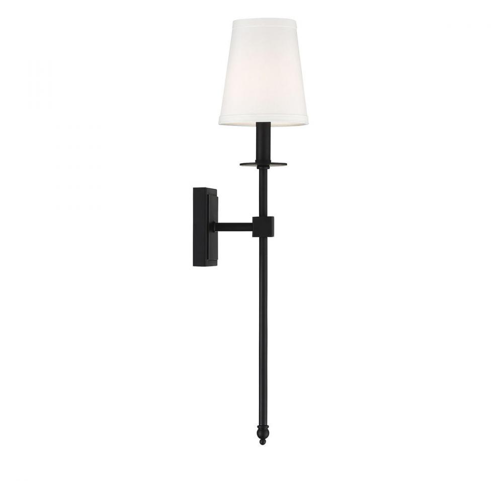This Savoy House Monroe 1-light sconce features a long sleek body, a white fabric shade and a classy, visual contemporary silhouette. Matte black finish. Sconces add a touch of style and light to any wall, including but certainly not limited to hallways, entryways, stairways, great rooms and dining rooms. You will also often see a pair of sconces flanking a bathroom vanity mirror to provide an even, flattering wash of light. Bulb not included. The matte black finish can be paired with black hardware or mixed with hardware in other finishes. Monroe is a perfect, comfortable addition to rooms of any style, especially transitional or classic. When you choose a Savoy House lighting fixture, you can be certain you’ve selected a piece that will withstand the test of time.