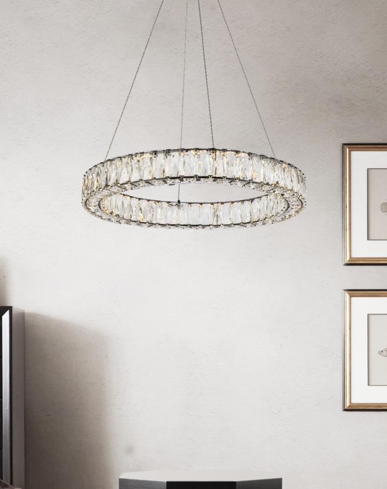 Diamonds are a girl’s best friend, and sparkling Monroe collection hanging fixtures take Marilyn’s famous lines to heart … for women and men alike. A minimal stainless-steel frame becomes dazzling when it is covered entirely with rectangular and square spectacularly faceted clear crystals. The oblong design hangs from almost invisible wires with brilliant integrated LED shining unseen from within. Stunning when placed in a dining room, kitchen, living room, or bedroom.