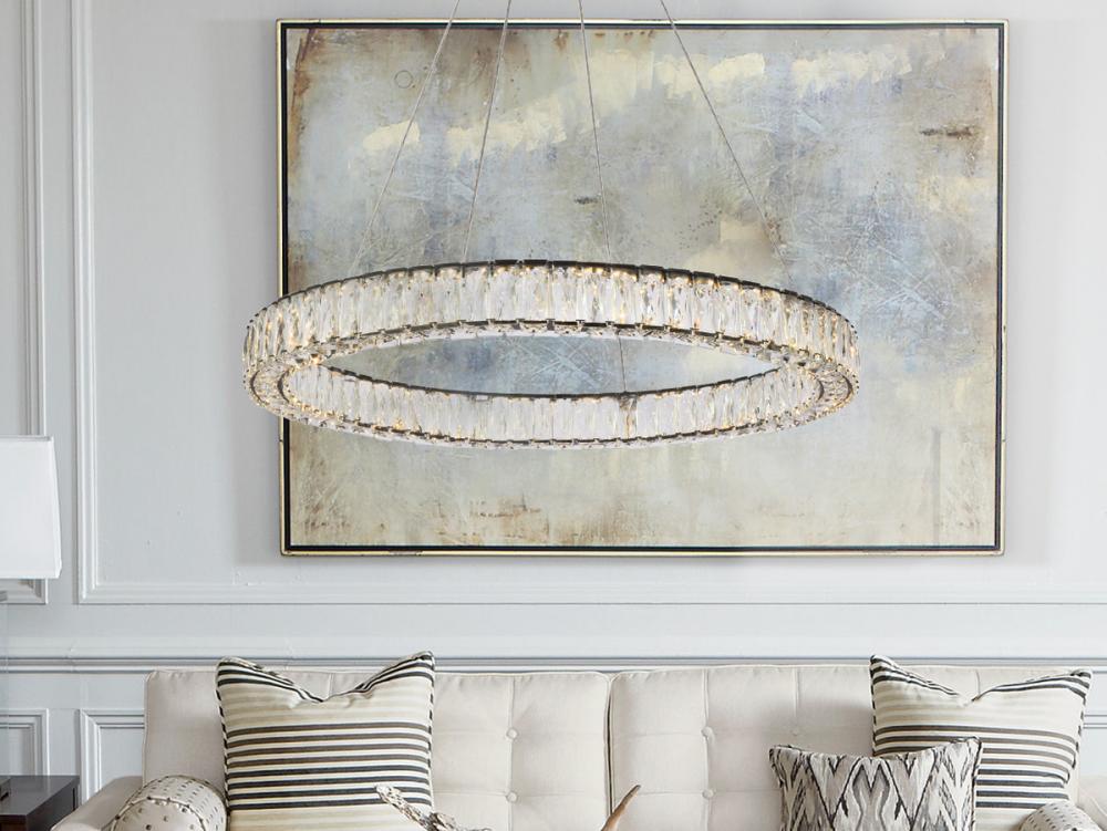 Diamonds are a girl’s best friend, and sparkling Monroe collection hanging fixtures take Marilyn’s famous lines to heart … for women and men alike. A minimal stainless-steel frame becomes dazzling when it is covered entirely with rectangular and square spectacularly faceted clear crystals. The oblong design hangs from almost invisible wires with brilliant integrated LED shining unseen from within. Stunning when placed in a dining room, kitchen, living room, or bedroom.