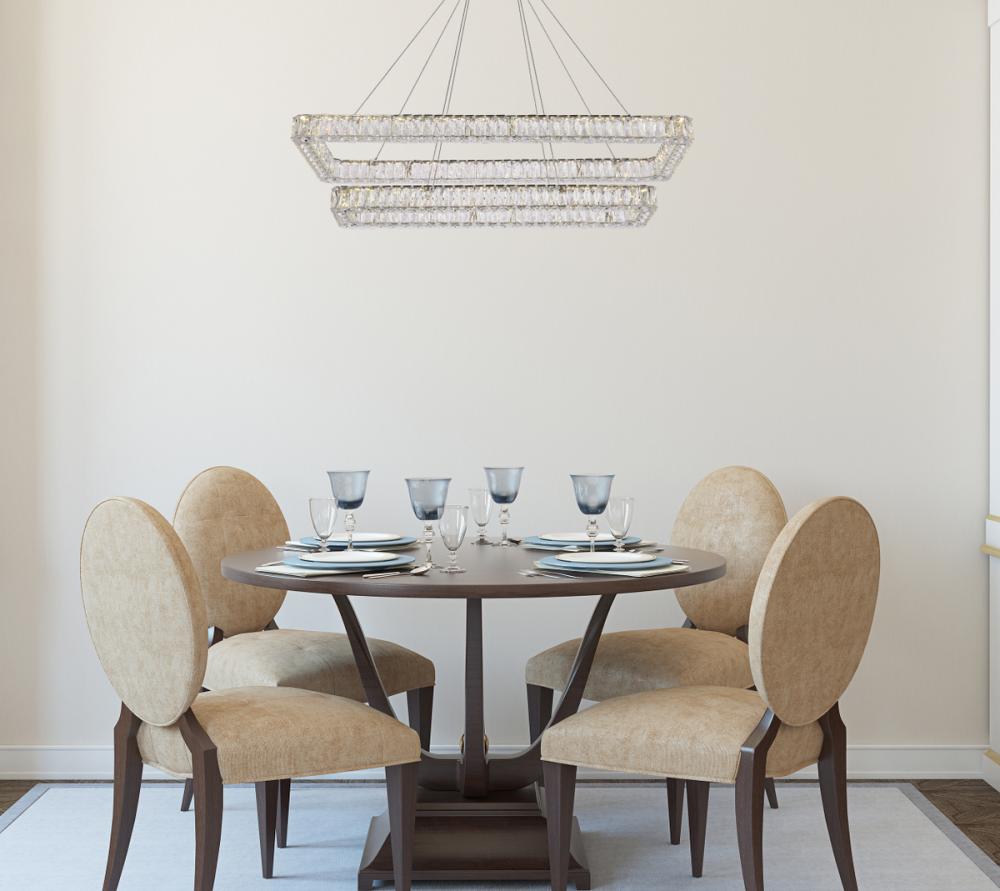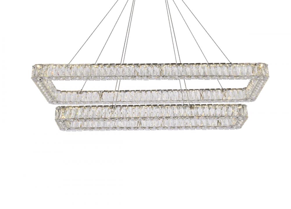 Diamonds are a girl’s best friend, and sparkling Monroe collection hanging fixtures take Marilyn’s famous lines to heart … for women and men alike. A minimal stainless-steel frame becomes dazzling when it is covered entirely with rectangular and square spectacularly faceted clear crystals. The oblong design hangs from almost invisible wires with brilliant integrated LED shining unseen from within. Stunning when placed in a dining room, kitchen, living room, or bedroom.
