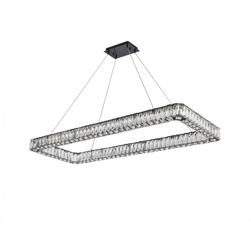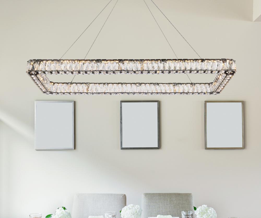 Diamonds are a girl’s best friend, and sparkling Monroe collection hanging fixtures take Marilyn’s famous lines to heart … for women and men alike. A minimal stainless-steel frame becomes dazzling when it is covered entirely with rectangular and square spectacularly faceted clear crystals. The oblong design hangs from almost invisible wires with brilliant integrated LED shining unseen from within. Stunning when placed in a dining room, kitchen, living room, or bedroom.