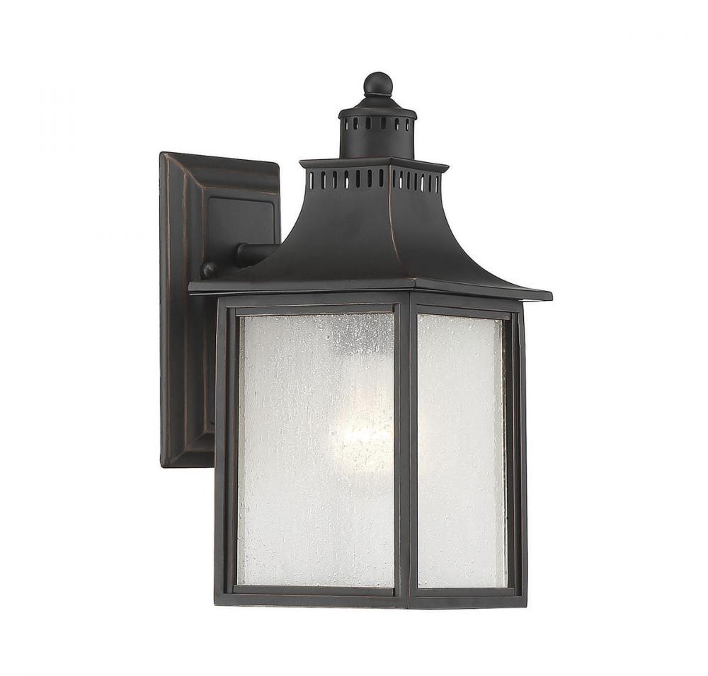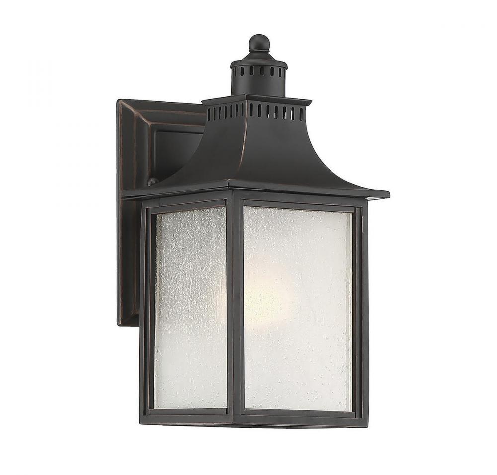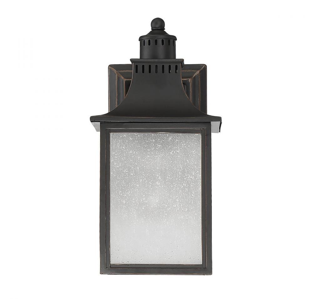 The Savoy House Monte Grande 1-light outdoor wall lantern is an elegant, clean-lined version of a classic box-shaped lantern. It’s a timeless and pleasing style from designer Karyl Pierce Paxton, a wall lantern that will illuminate the exterior of your home and welcome you and your guests with a familiar, traditional aesthetic. The English bronze finish is a wonderful neutral and the panels are made of beautiful pale cream seeded glass. One 60W standard size bulb provides plenty of soft light. This lantern is 5.5" wide, 11.5" high and UL rated for wet locations.