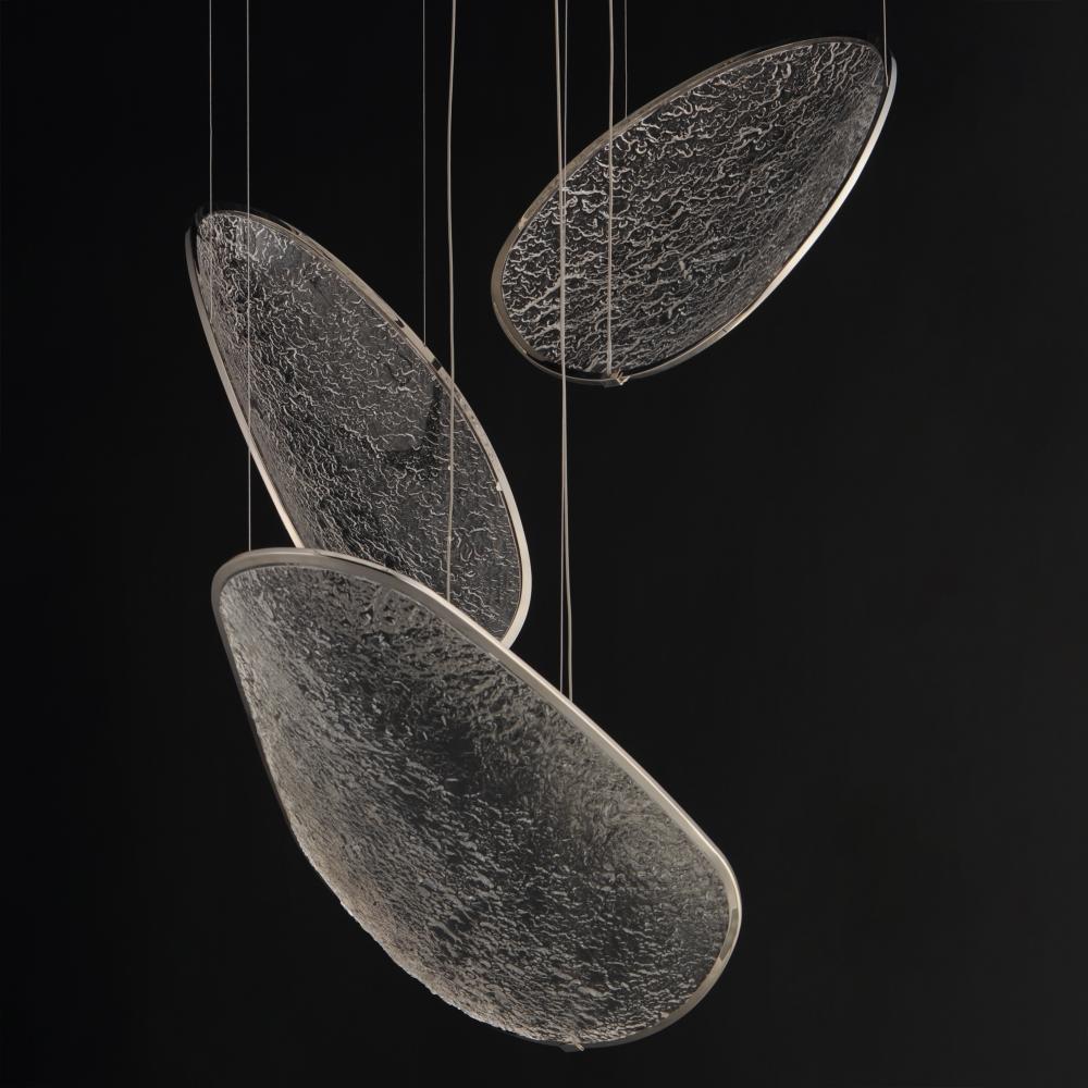 A triumph of scale, craft, and light, Moonscapes transforms celestial inspiration into a breathtaking installation. Monumental in form yet ethereal in presence, each irregularly shaped panel evokes the cratered terrain of the lunar surface with dramatic te