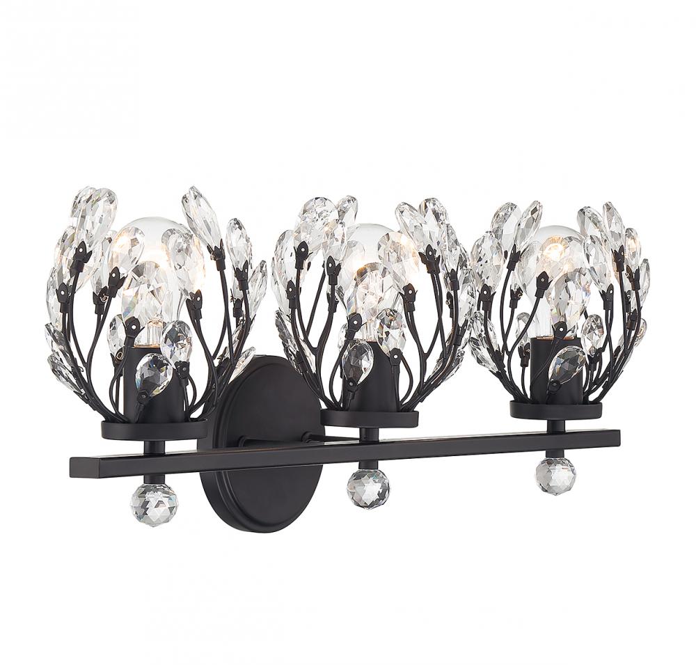 Give your bathroom its flowers with the whimsical Savoy House Moreno 3-light bath vanity light. Metal stems topped with clear crystal buds surround each light to create a look that is always fresh and fun, whether the lights are on or off. Finished in matte black. Moreno is 9.5" in height, 23.5" in width and extends 6.75" from the wall. It uses 3 standard size bulbs of up to 60 watts per bulb (bulbs not included).